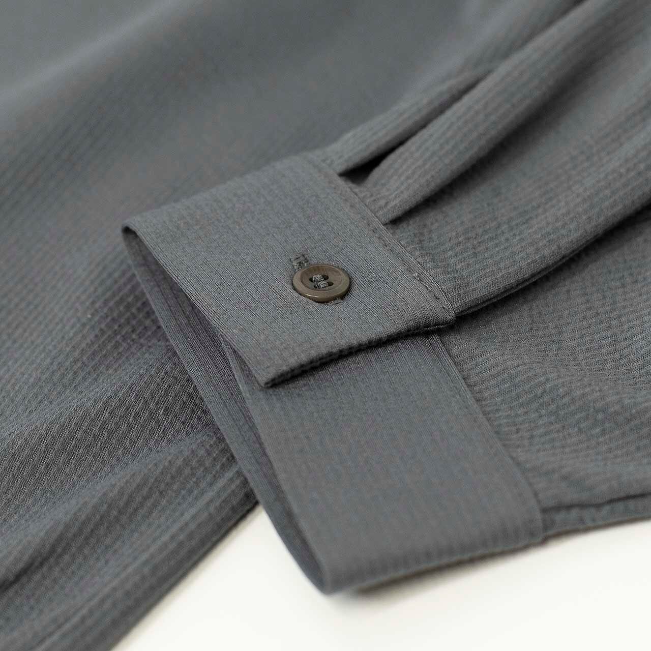 ピケサッカージャージーを用いたバンドカラーのシャツ。PBT繊維(ポリブチレンテレフタレート)という伸縮性のある糸を36ゲージで編むことで、軽くて張り感のある仕上がりになっています。ボタンを留めずにシャツジャケットとして羽織って着用しても着崩れません。生地の表面に凹凸のあるサッカー素材なので肌離れも良く、濃度差の少ないカラーでのシャドーストライプは主張し過ぎず、どんなコーディネートにも馴染みます。シルエットは適度なゆとりのあるシンプルなレギュラーフィットで、袖口は「いってこい始末」。タグワ椰子を原料とした植物性由来のナットボタンを使用。