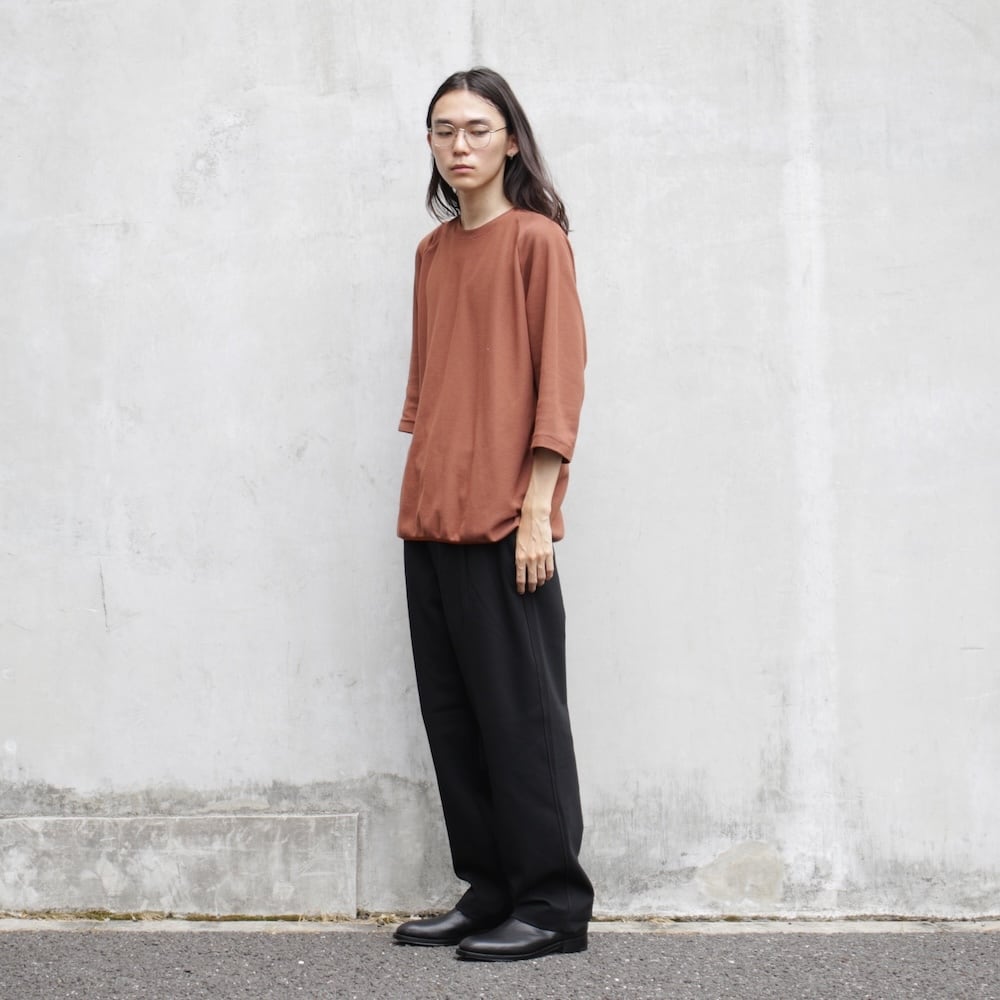 カノコ編みのように凹凸に編まれたポリエステルブレンドのコットンニットを用いた七分袖のTシャツ。スーピマコットンの中でももっとも繊維長が長く強度に優れているAlbini社の超長綿CORCORANに、ポリエステルをブレンドすることで吸水速乾性を持たせました。軽量で肌離れも良く少し細めの七分丈の袖は、一枚着用は勿論のこと、上に羽織を着用しても袖のゴワツキも無く、長引く夏の現代の気候にフィットした着用期間の長いアイテムとして重宝します。インナーとしての着用も想定し、裾をストレッチバインダー仕様にすることで、シルエットに締まりが出てスッキリとしたバランスを保っています。