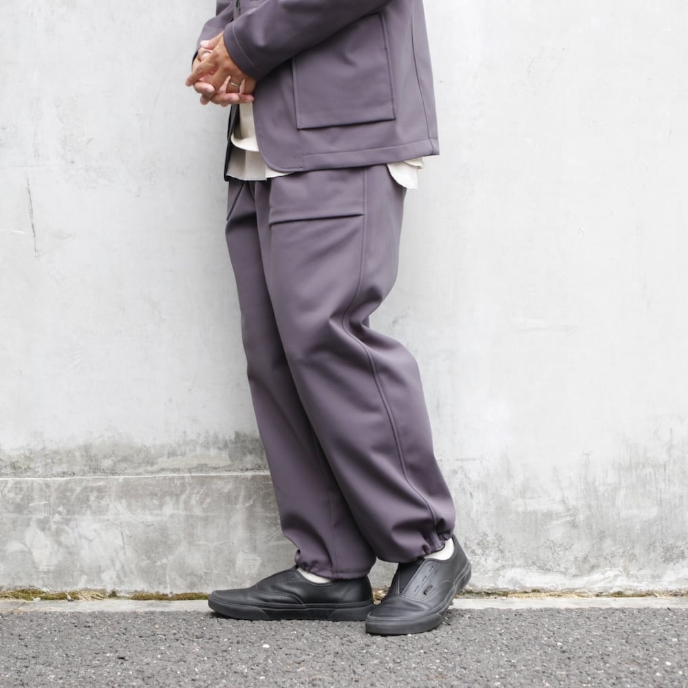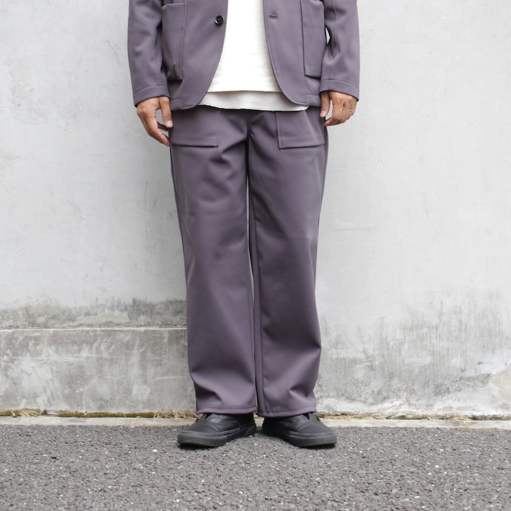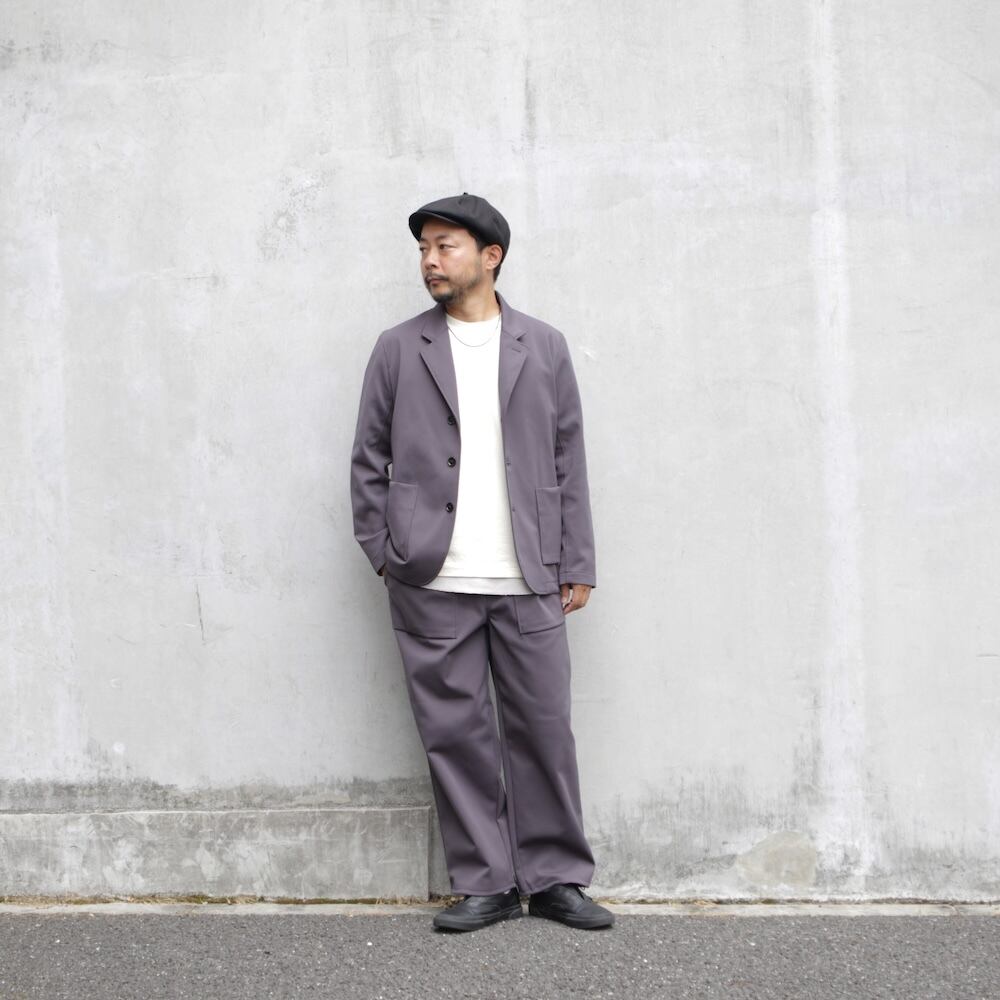 蝶理(株)の高伸縮機能糸TEXBRID®をハイゲージで編み立てたダンボールニット素材を用いたワイドパンツ。軽量、伸縮性に優れながらも、形状記憶的な張り感とコシを併せ持つことで、シルエットがしっかり出る特徴があります。前身頃に底マチ付きのパッチポケットをあしらいカジュアルな雰囲気ではありますが、素材の特性上すっきりと上品に仕立て映えしています。後ろベルトのみにエラスティックバンドを使用したバックイージー仕様。同素材のジャケットとのセットアップも可能。