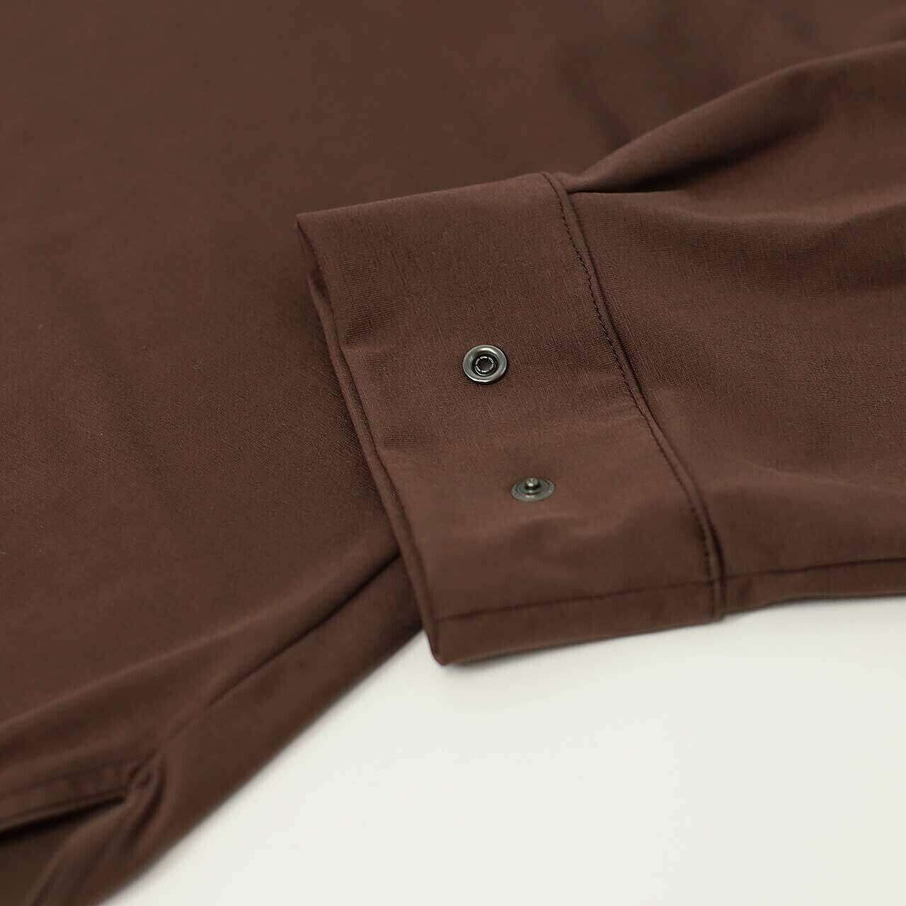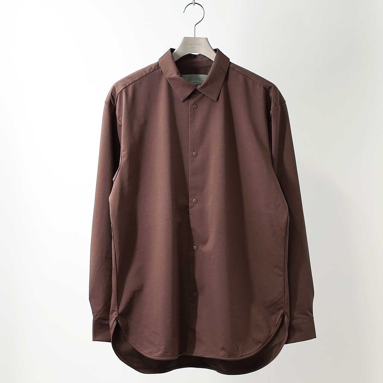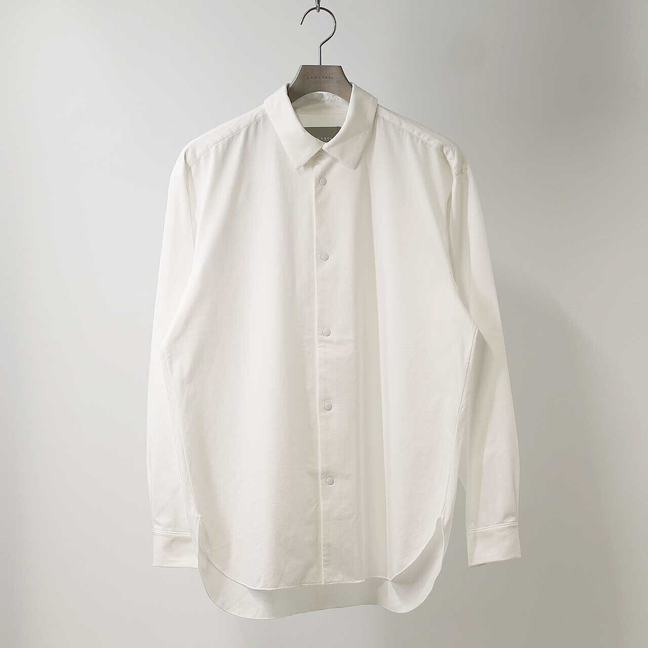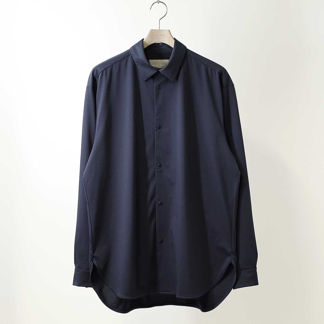 ポリエステルとコットンをブレンドして編み立てた天竺素材を用いたシンプルなシャツ。ハイゲージかつプレーティングで編み立てているため、適度なハリ感があり、表面には特殊加工を施し毛羽を抑え、ナチュラルな光沢感のある滑らかな風合いに仕上げています。シルエットは適度なゆとりを持たせながらもスッキリとしたコンパクト仕様。少し小さめのサイズの同系色ドットボタンは身生地に馴染みスッキリとした印象。また第一ボタンを外してもだらしなく見えないよう第二ボタンを高めに設定しています。開きの無い独自の筒袖カフス仕様。今シーズンからは裾の処理をメローロックから裏バインダー仕様へ変更し、縁取りの様な飾りと、より美しいラウンドの形を実現。バックヨークにはカットソー素材では難しいギャザーを施し、クラシックな印象を加えています。