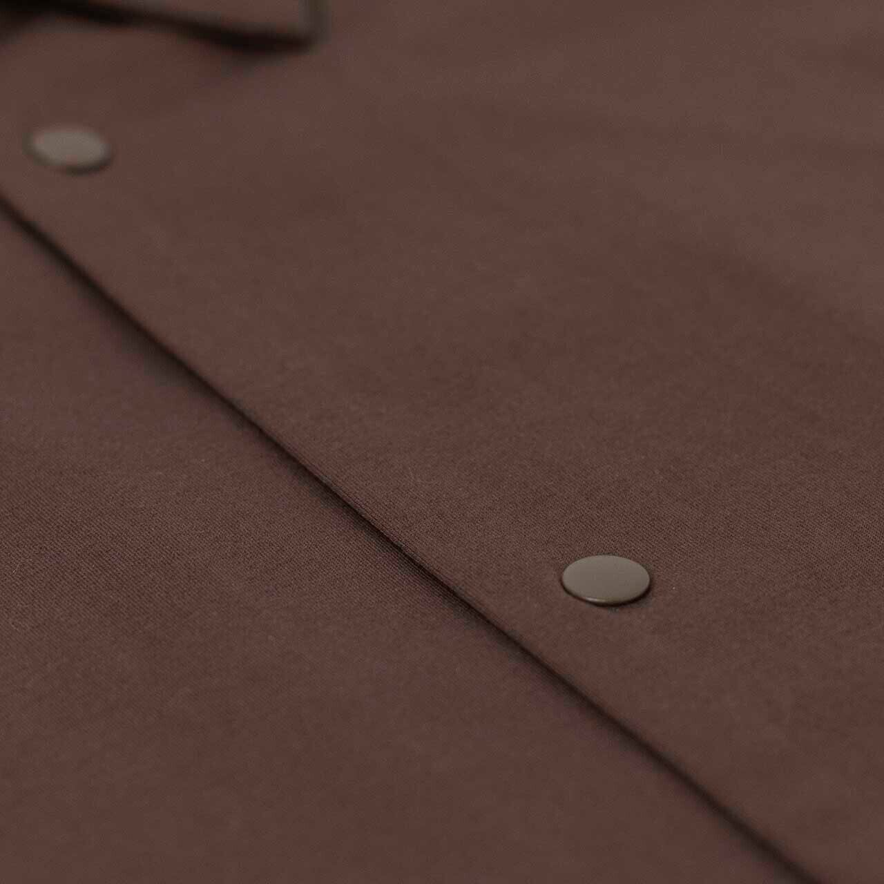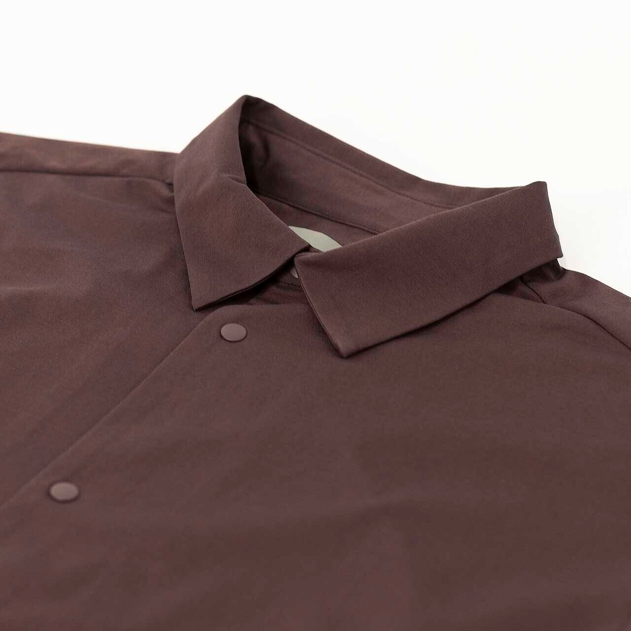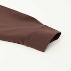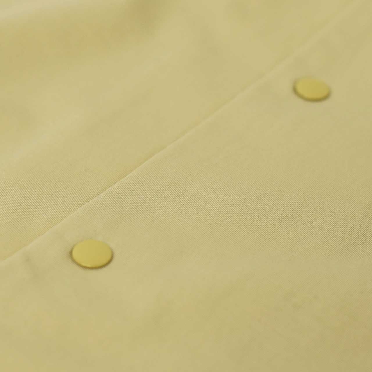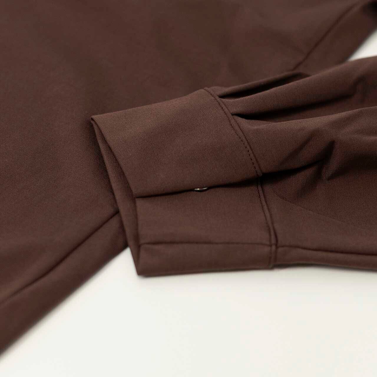 ポリエステルとコットンをブレンドして編み立てた天竺素材を用いたシンプルなシャツ。ハイゲージかつプレーティングで編み立てているため、適度なハリ感があり、表面には特殊加工を施し毛羽を抑え、ナチュラルな光沢感のある滑らかな風合いに仕上げています。シルエットは適度なゆとりを持たせながらもスッキリとしたコンパクト仕様。少し小さめのサイズの同系色ドットボタンは身生地に馴染みスッキリとした印象。また第一ボタンを外してもだらしなく見えないよう第二ボタンを高めに設定しています。開きの無い独自の筒袖カフス仕様。今シーズンからは裾の処理をメローロックから裏バインダー仕様へ変更し、縁取りの様な飾りと、より美しいラウンドの形を実現。バックヨークにはカットソー素材では難しいギャザーを施し、クラシックな印象を加えています。