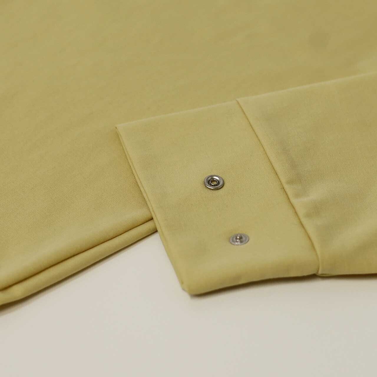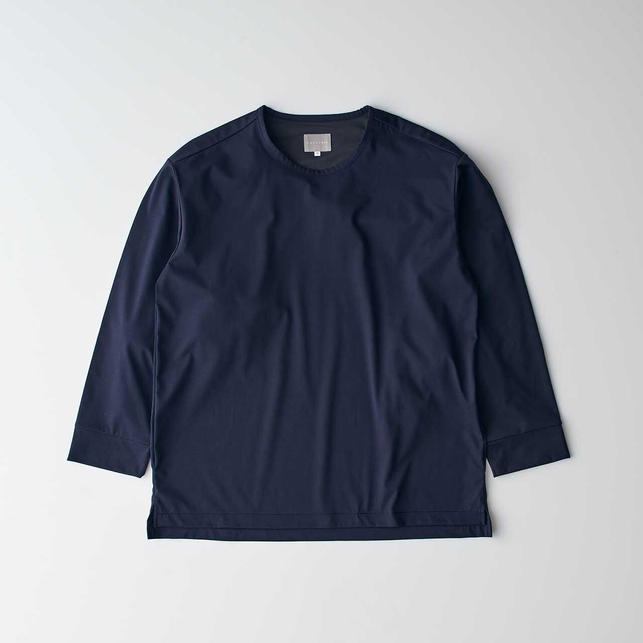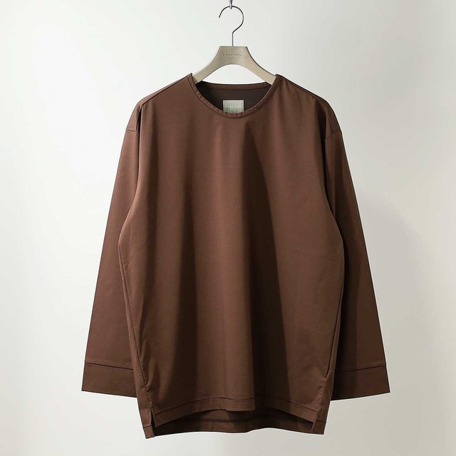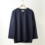 ポリエステルとコットンをブレンドして編み立てた天竺素材を用いたロングスリーブTシャツ。ハイゲージかつプレーティングで編み立てているため、適度なハリ感があり、表面には特殊加工を施し毛羽を抑え、ナチュラルな光沢感のある滑らかな風合いに仕上げています。シャツのエッセンスから抜粋したヨーク切り替え部の裏側に別布を使用することで肩周りがしっかりし、ランドリー際の伸び防止にもなっています。袖カフスのドットボタンを閉めればシャツの様な見え方になり、開けても袖口には十分なゆとりがあるのでロールアップも可能。ジャケットなどエレガンスなアイテムとのコーディネートを想定して作られているので、シルエットはコンパクトにまとめました。洗練されたドレス感覚のTシャツです。