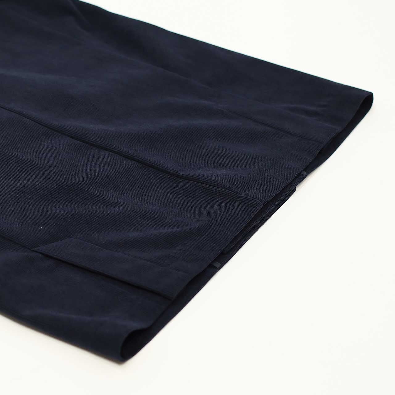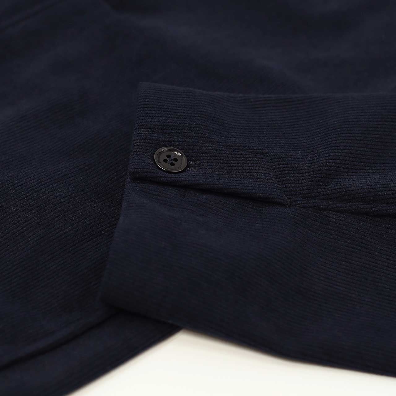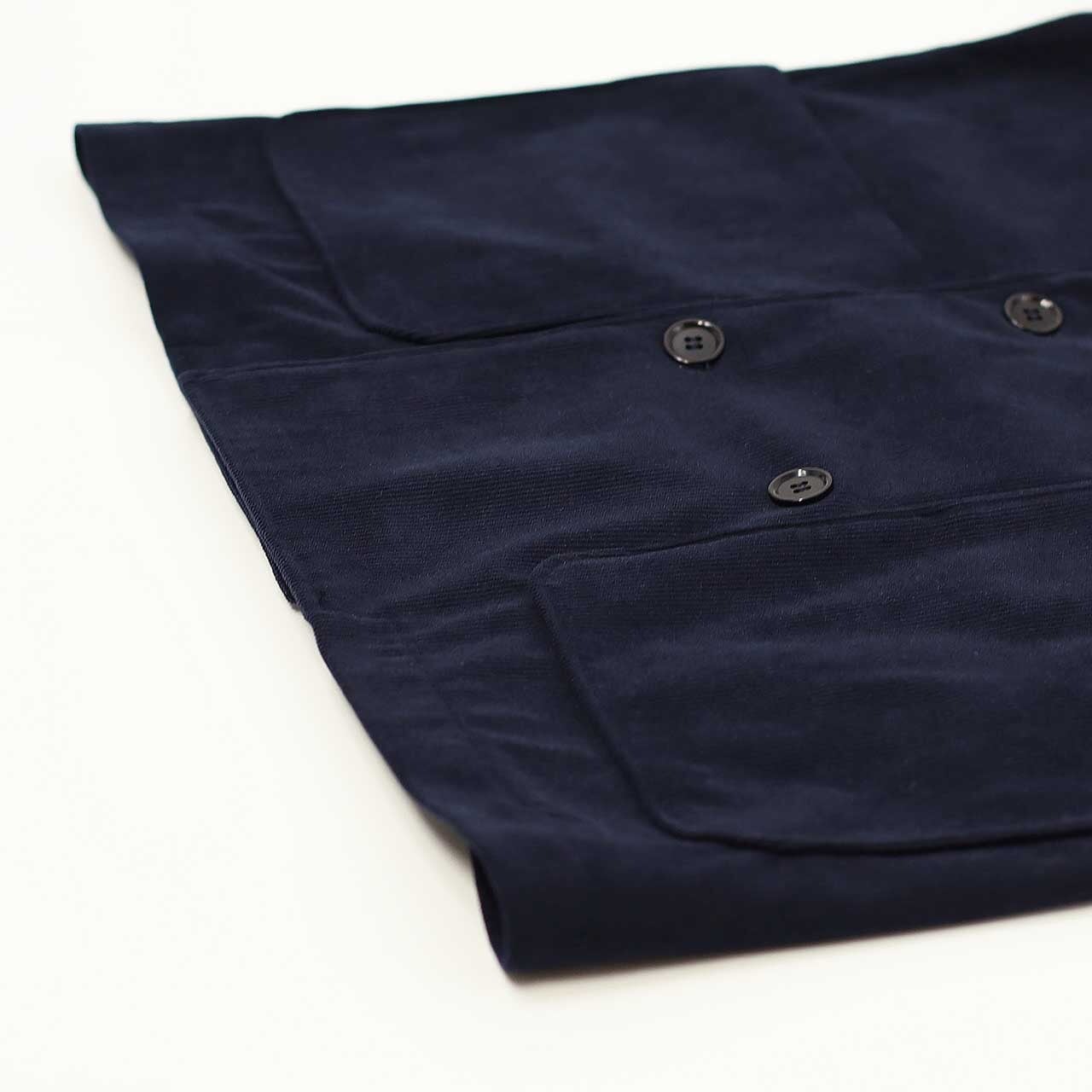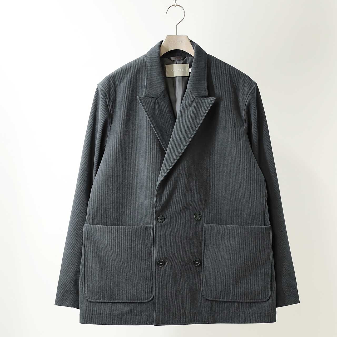トリコット素材のポリエステルコーデュロイを用いたセミピークドラペルの4ボタンダブルブレステッドジャケット。ビジネスシーンでもタウンユースでも両用できるよう適度なゆとりのあるボックス型シルエット。布帛のコットンコーデュロイと比べると野暮ったくなくスッキリと見え、通常のパイルカットコーデュロイと異なり毛房が抜けることも無いのでお手入れも簡単。適度な張り感があるのでボタンを外して着用する時もシルエットが崩れることなく綺麗に保てます。ポリウレタン未使用ながらナチュラルなストレッチ性を持たせているので、ストレスフリーな着心地。