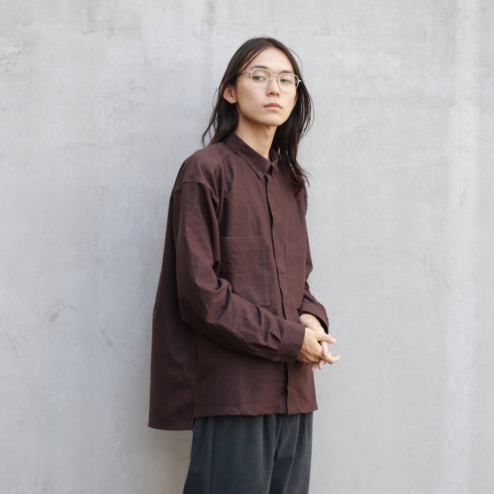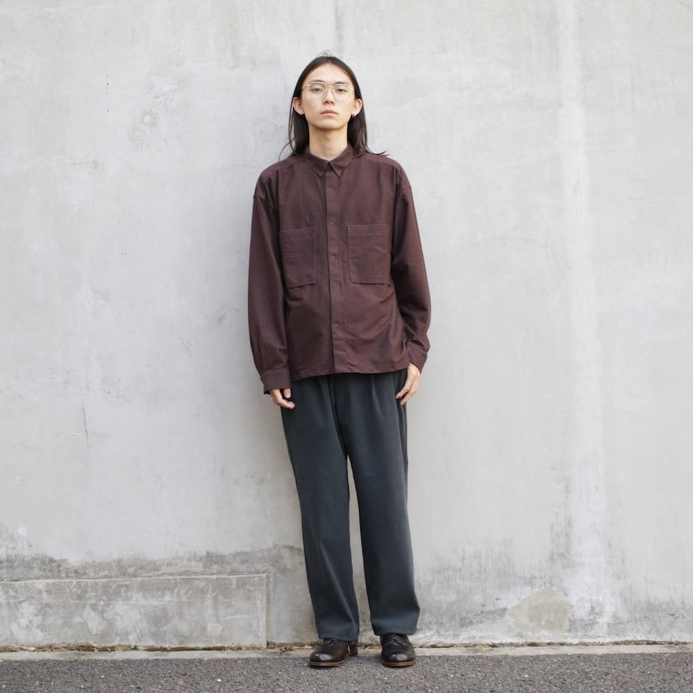 ニットネル素材を用いたボタンダウンシャツ。伸縮性に優れている東レ社のポリエステル系複合繊維T400と60/2コットン糸をハイゲージで編み、尾州地区にて丁寧なピーチ起毛加工を施されたジャージーのネル素材。布帛のネルシャツよりも圧倒的に軽く、エレガントな表面感、仕立て映えの良さ、ポリウレタンを使用しない自然な伸縮でストレスフリーな着心地です。従来のラフでカジュアルな「ネルシャツ」の概念を覆すアイテム。左右の胸元にはパッチポケット、襟は敢えてロール無しのチビ襟ボタンダウンなので、ダンガリーシャツとアイビーのエッセンスを取りつつもモダンに仕上げています。襟の裏側には適度にコシのある布帛を使用しているので、洗濯を繰り返しても襟の型崩れを防いでくれます。