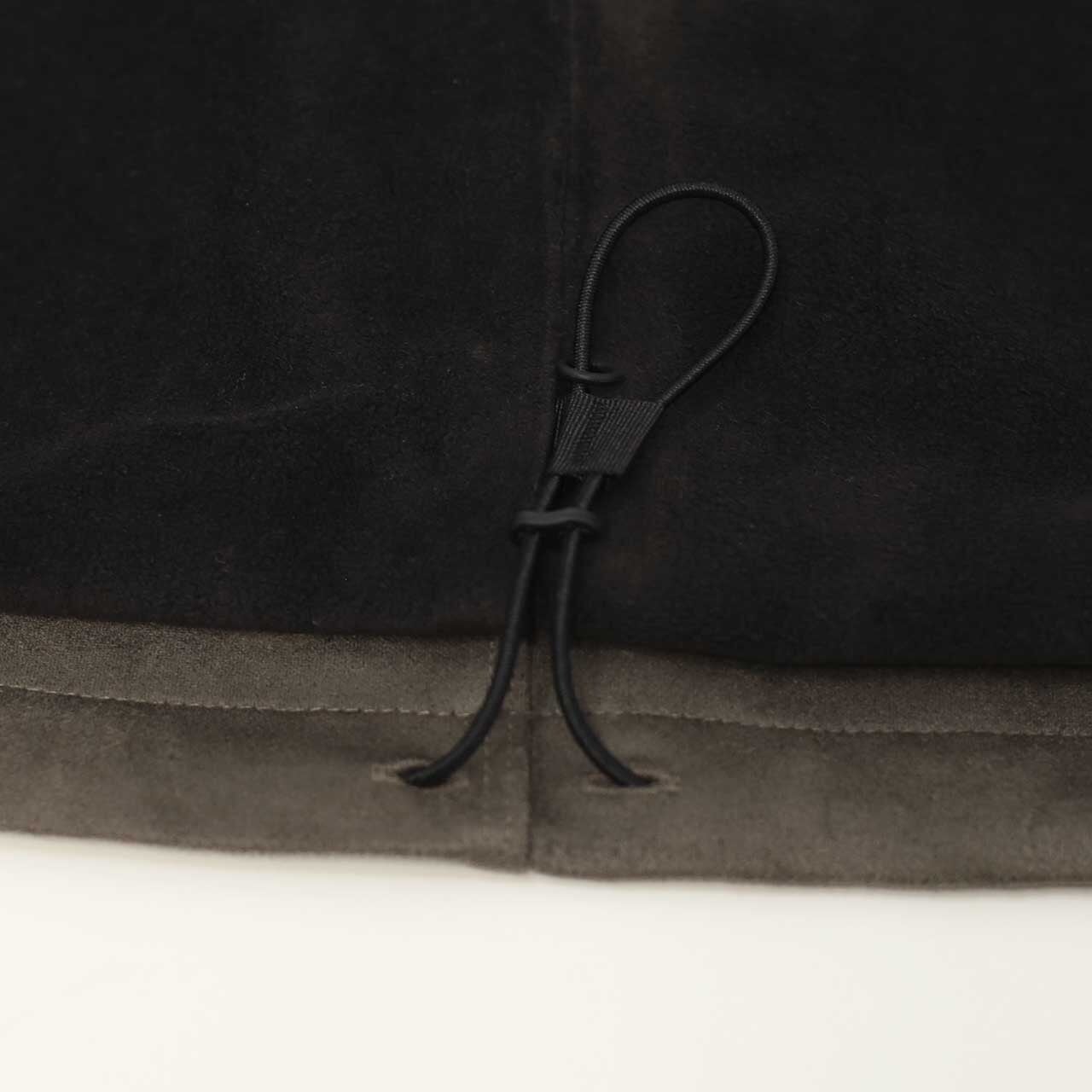 リサイクルポリエステル原料のダンボールスエードを用いたジップアップブルゾン。リラックス感のあるゆったりとしたシルエットなので程よいドレープが生まれ、スエード生地特有の陰影が綺麗に出ます。身頃には薄手のフリースを、袖には滑りの良いトリコット裏地を用いています。裾にはドローコードがあるので、ブラウジングしてシルエット変化を楽しめます。前袖はシャツ袖で後ろ袖がヨークスリーブのスプリットスリーブ仕様。左身頃の胸にはシームポケット、右身頃の裾内側にはパッチポケット有り。