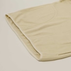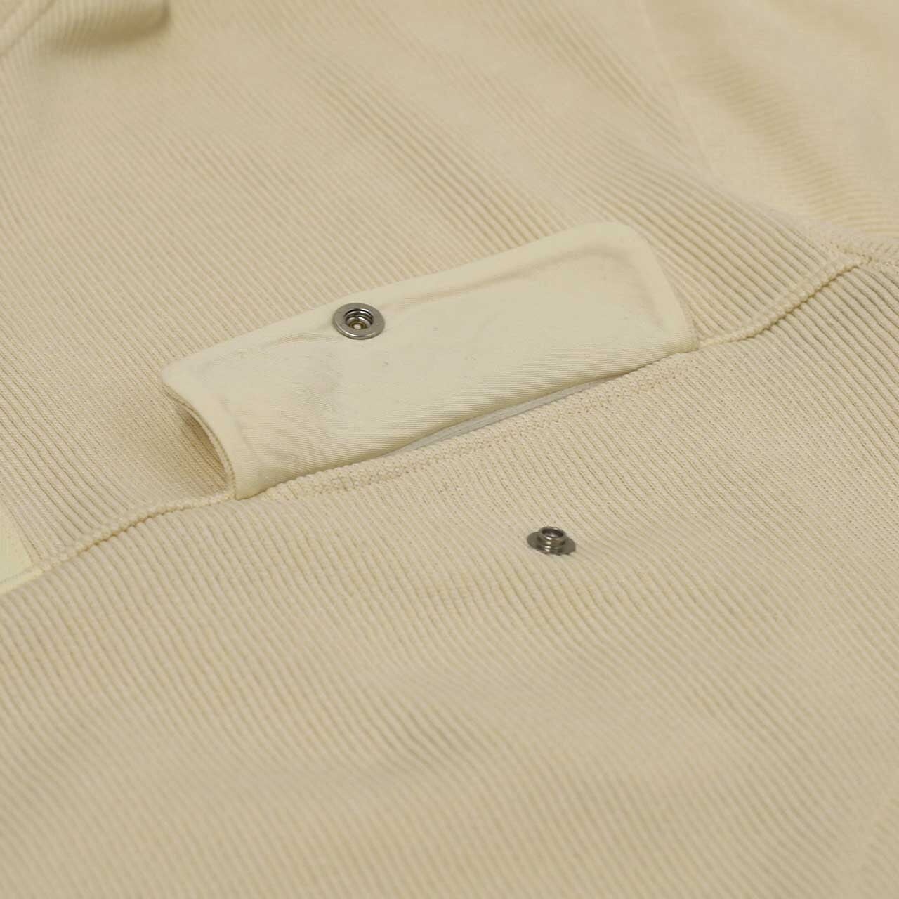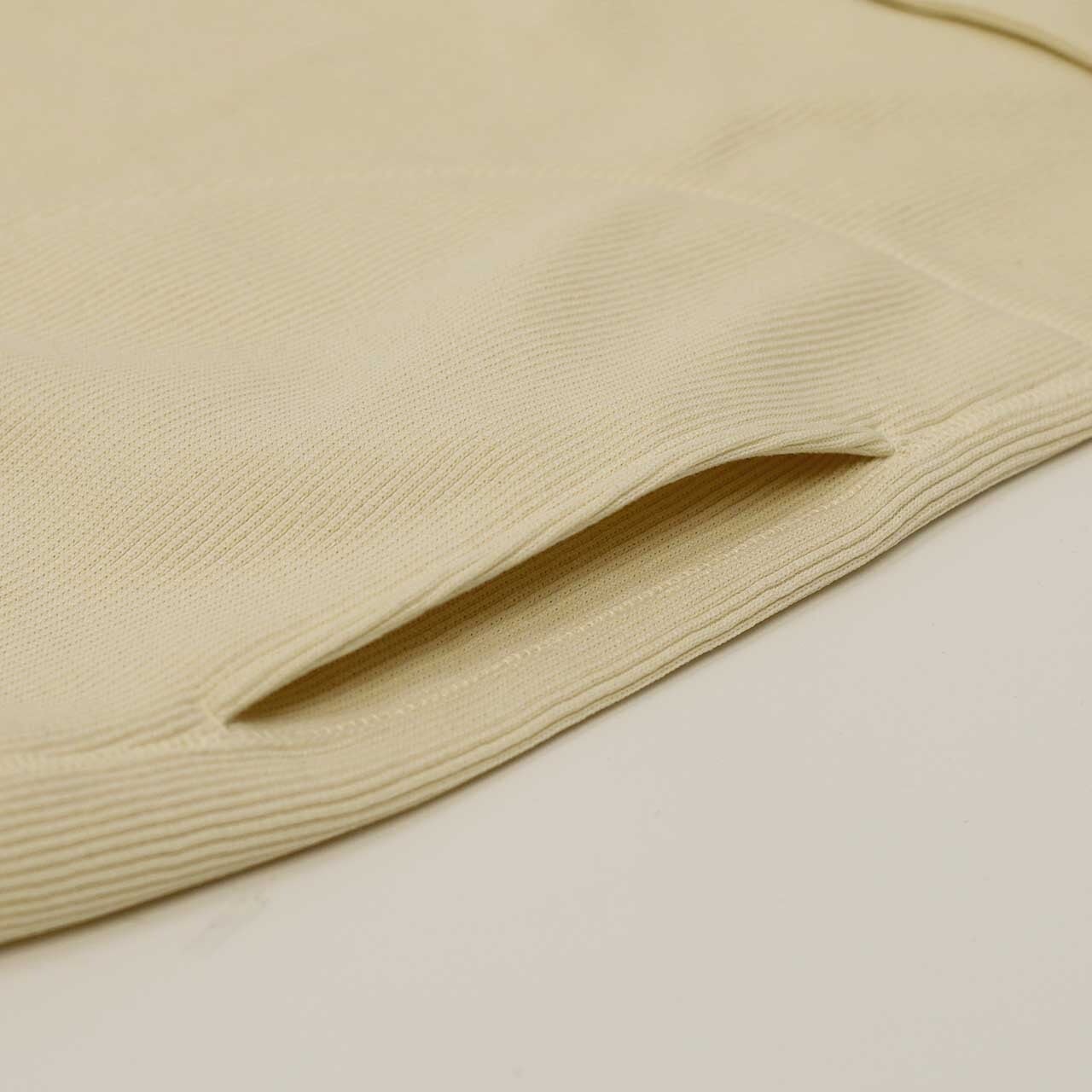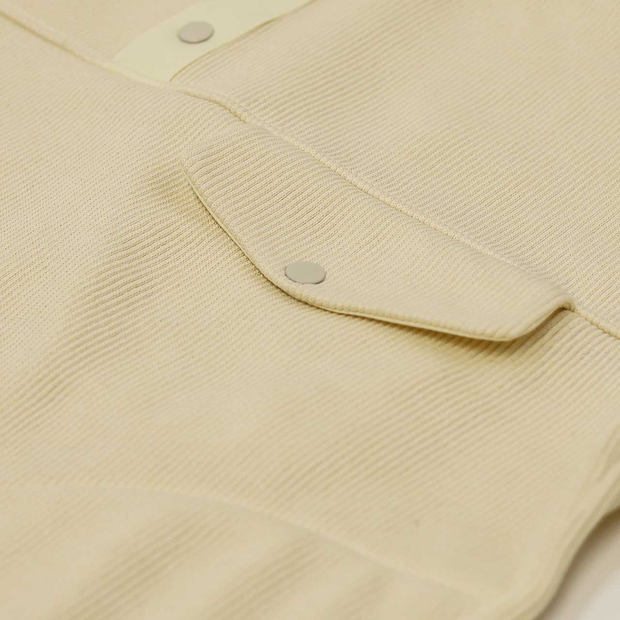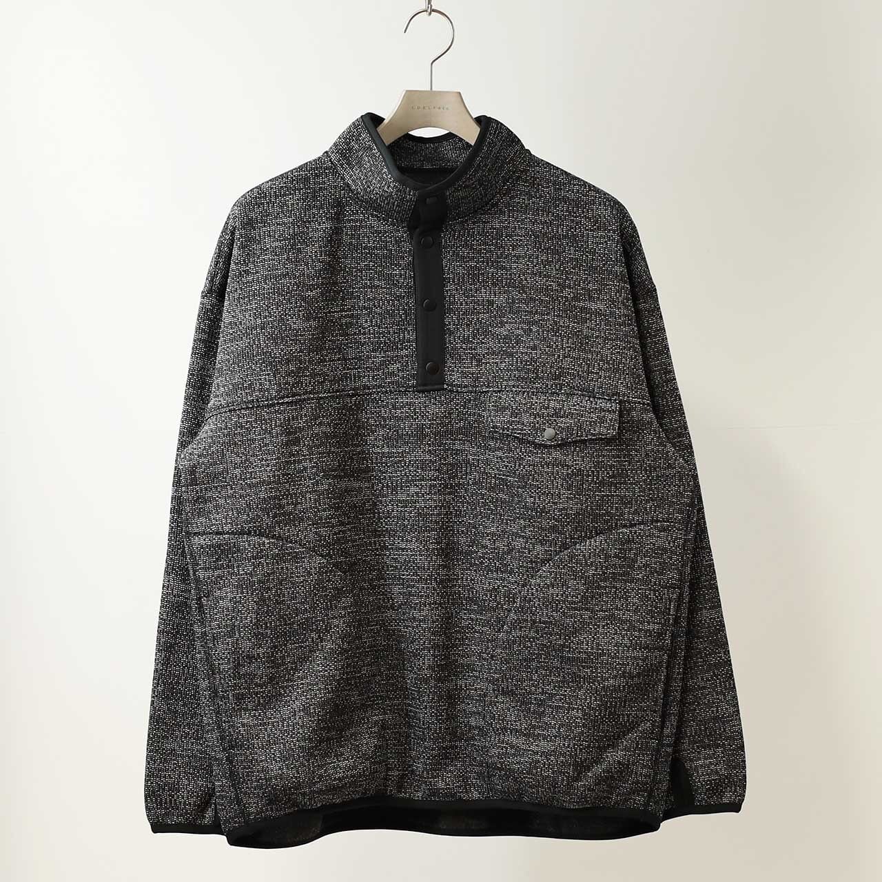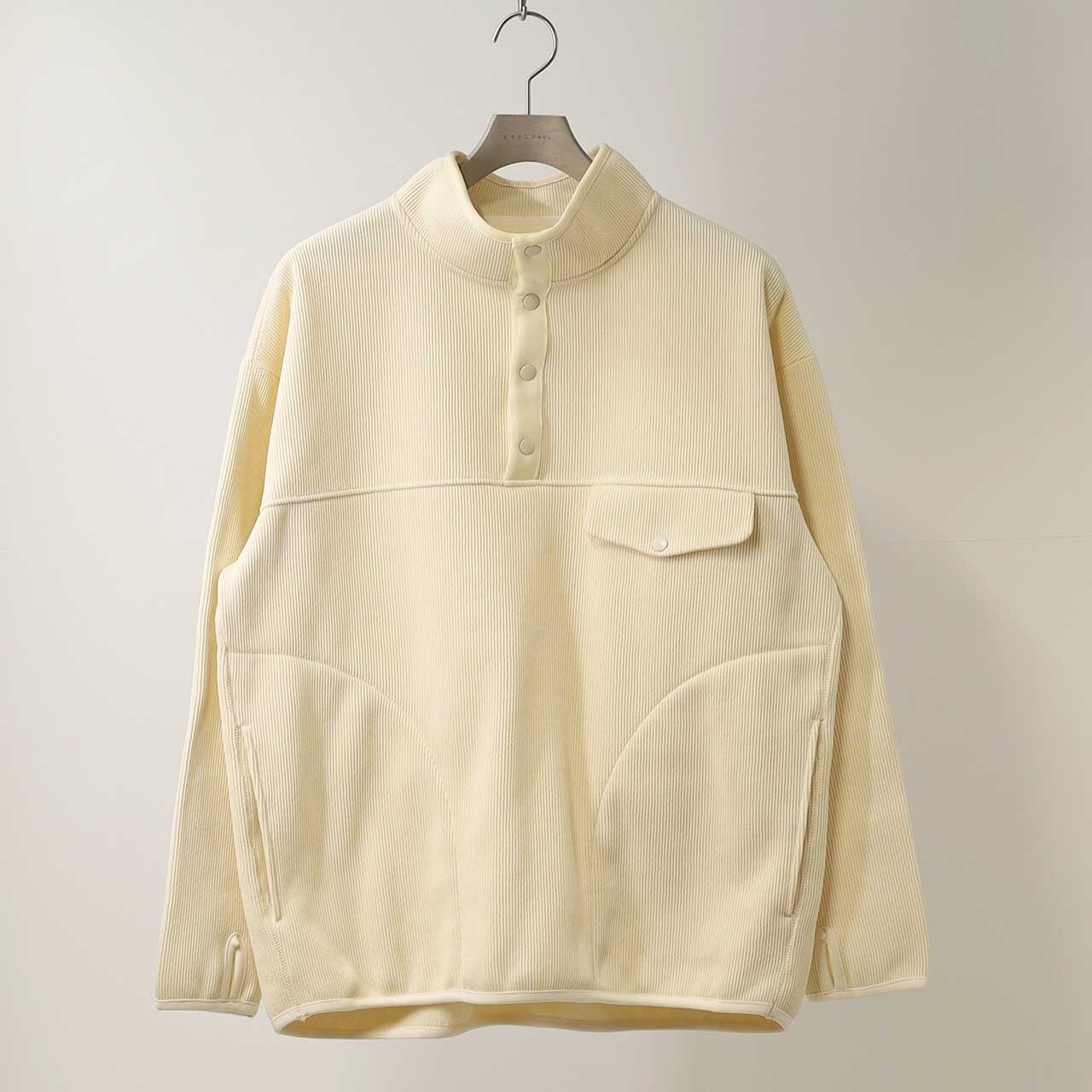 裏起毛が施されたポリエステルニットを用いたチムニーカラーのアノラック。表面は縦畝のざっくりとしたニットで裏面は起毛加工された暖かいフリース。2枚をボンディングするのではなく編み方や加工を工夫し布1枚で表現しているので、圧倒的な軽さを実現。アノラックのエッセンスを取り入れながらもフードではなくスタンドカラーを採用。広めの天幅と浅めの前下がりが特徴の平面的でレトロな雰囲気に仕上げています。フラップ付きの胸ポケットとウエスト部分にはシームポケット有り。