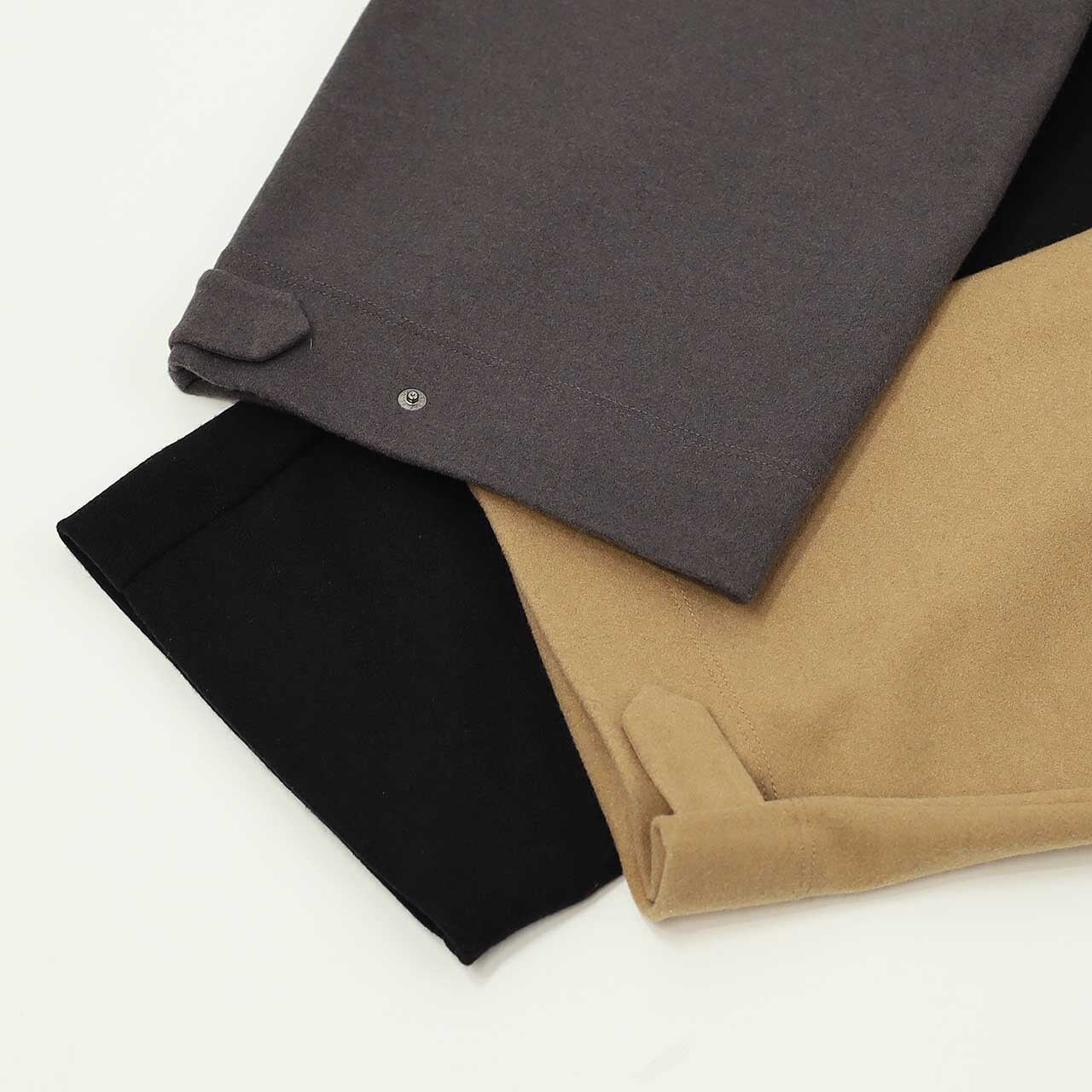 メルトンライクな中肉ジャージーを用いたストレートシルエットのパンツ。吸湿発熱機能のあるリサイクルポリエステルをベースに、レーヨンとアクリルをブレンドする事でソフトな仕上がりになっています。一般よりも少し太めのベルト幅のフロントには2つの隠しドットボタン。後ろは裁ち出しベルト仕様。ポケットは前後とも切り替え利用デザインのため、後ろから見てもスッキリと仕上がっています。裾部分にはタブをあしらい、シルエット変化を楽しめます。後ろベルトのみにエラスティックバンドを使用したバックイージー仕様。