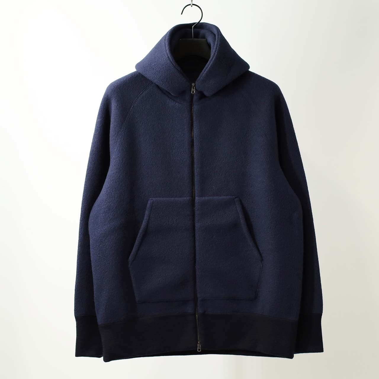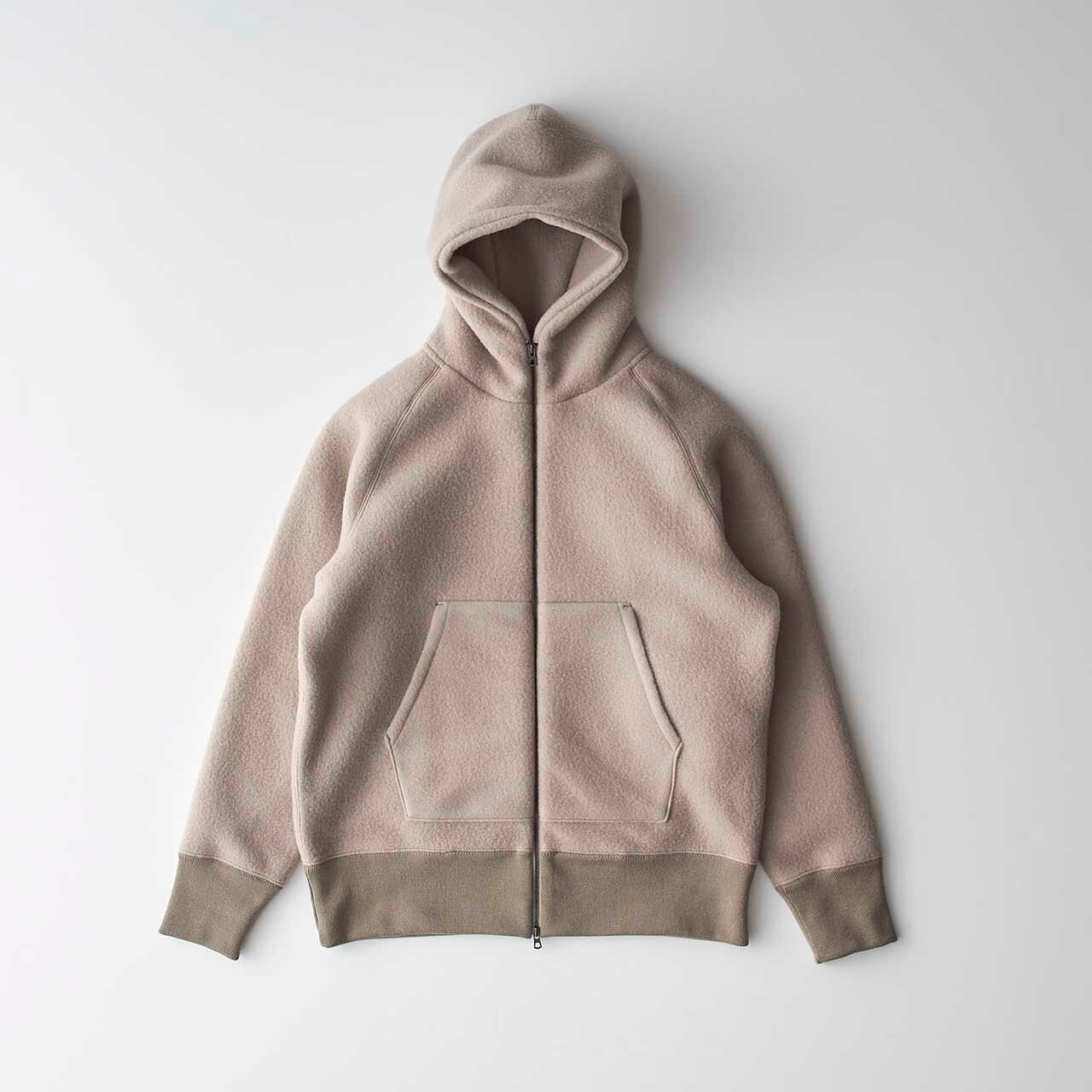 ウール起毛ダンボールニットを用いたジップアップパーカ。オーストラリア原産のSuper100'sの梳毛糸を使用し、尾州地区にて編み立てられました。特殊な編み方をしたダブルニットの両面に起毛加工を施し、肉厚でコシがありながらも驚くほどの軽量性を実現。紡毛糸ではなくあえて上質な梳毛糸を贅沢に使用することで、カジュアルながらもエレガントな雰囲気を持つ表面感に仕上がっています。形は身幅と袖幅に程良くゆとりを与え、リラックスして着用できるシルエット。胸周りには適度な分量を持たせつつも裾へと緩やかにテーパードをかけているので、スッキリとした印象になっています。