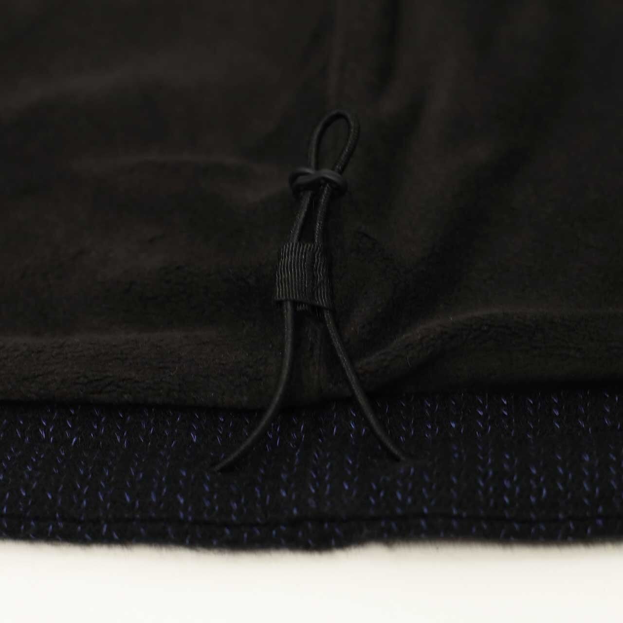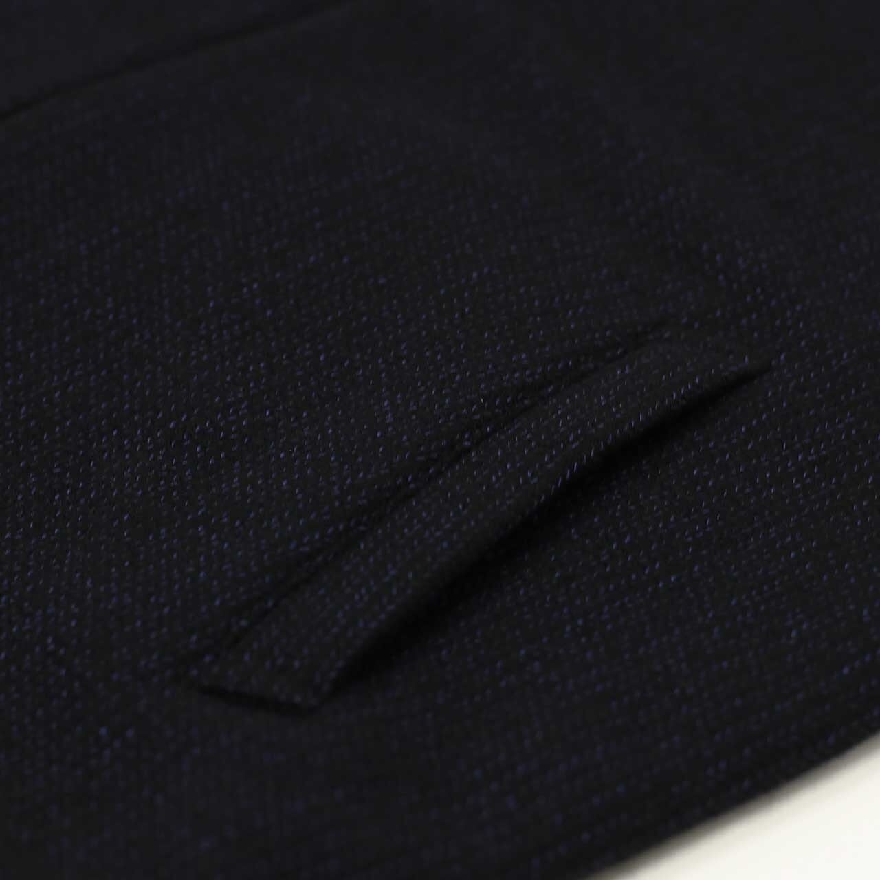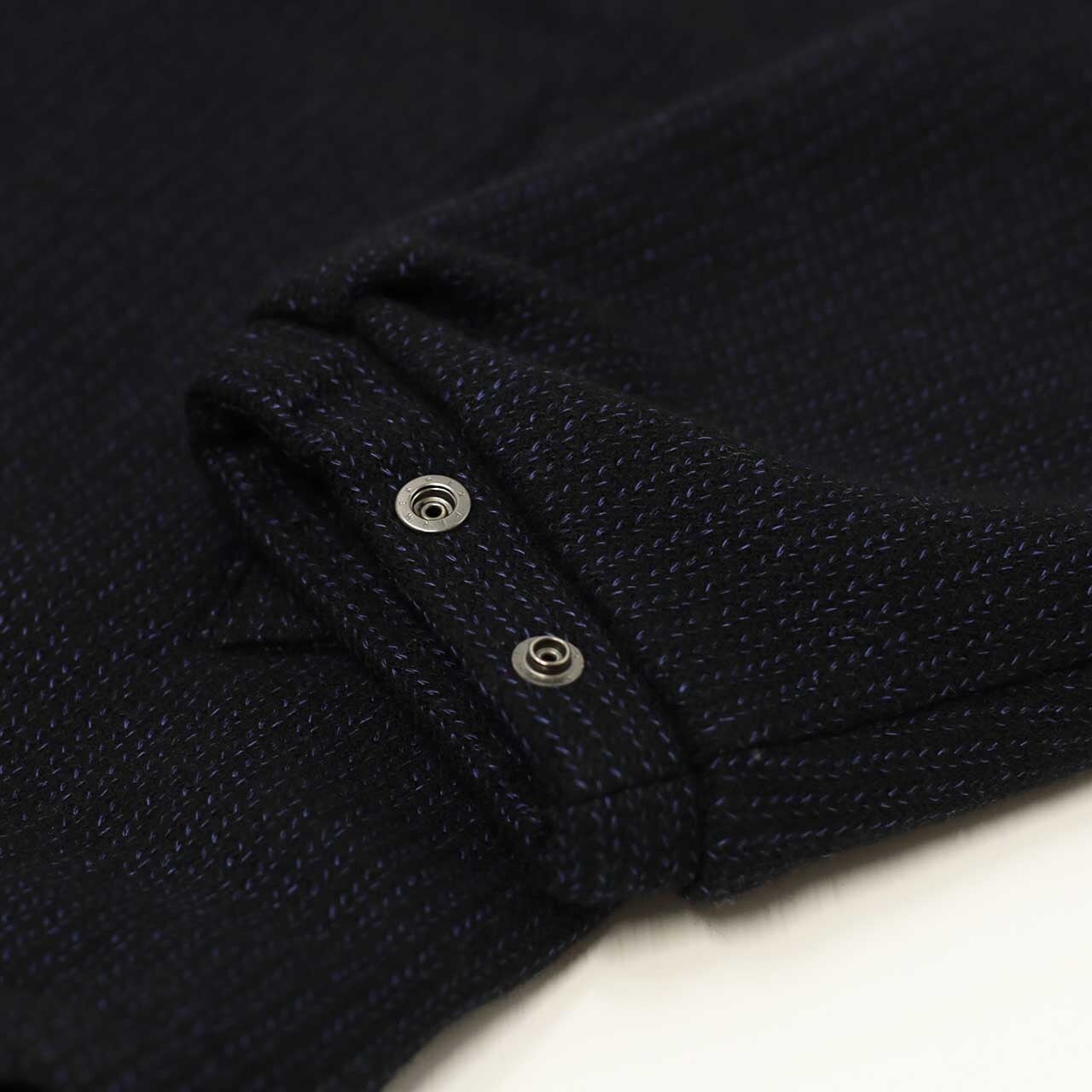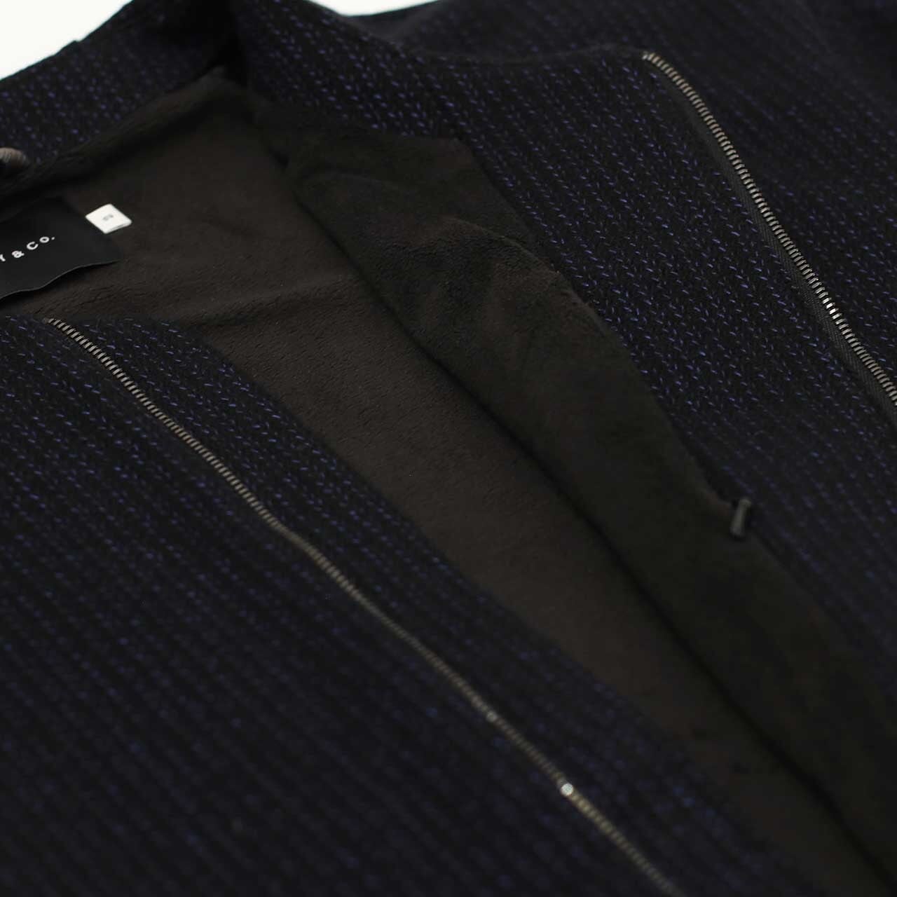 ビーチクロスを用いたジップフロントのブルゾン。ビーチクロスとは20世紀初頭にアメリカ東海岸で誕生したウールとコットンの混紡糸をラッセル編み機で編み立てた生地で、寒冷地の防寒着として使用されていたもの。その見た目と構造をベースに、軽量でサステナブル原料を用いて現代に合わせてリプロしました。粗野な生地を敢えてミニマルなノーカラーのボックスシルエットデザインに落とし込むことで、モダンとクラシックが合わさった独特なアイテムに仕上がりました。身頃裏には薄手のフリースを使用しているので長い期間着用が可能。インナーにフードやタートルを合わせても襟元がごわつかず、すっきりとした印象を与えてくれます。シャドーストライプを活かしたスプリットラグランスリーブで前後の表情に変化を出しています。裾のドローコードを絞ることでシルエット変化も楽しめます。