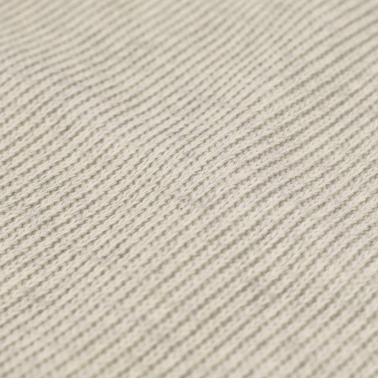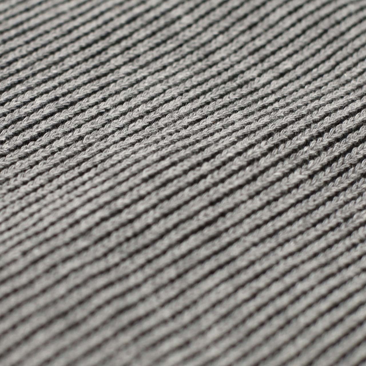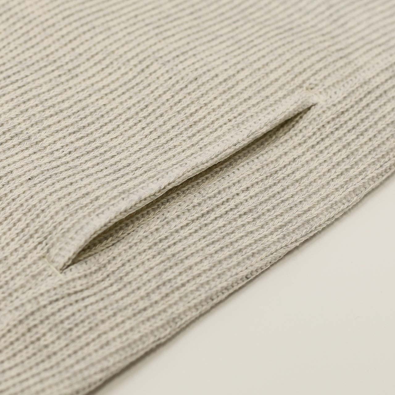 表はコットン、裏はポリエステルで異なるゲージで編まれたクォーターゲージニットを用いたクルーネックプルオーバー。一般的なローゲージニットの様に見えながらも裏面はポリエステルハイゲージニットなので、キックバックを保つことができ、型崩れしません。丸編みとニットの長所をハイブリッドさせた新しい素材です。素材自体がバルキーな印象なので、裾や袖口はストレートな折り返し始末でスッキリと見せ、ボディは適度なゆとりを持たせたオーセンティックなシルエットを採用。ウエスト部分にはシームポケット有り。