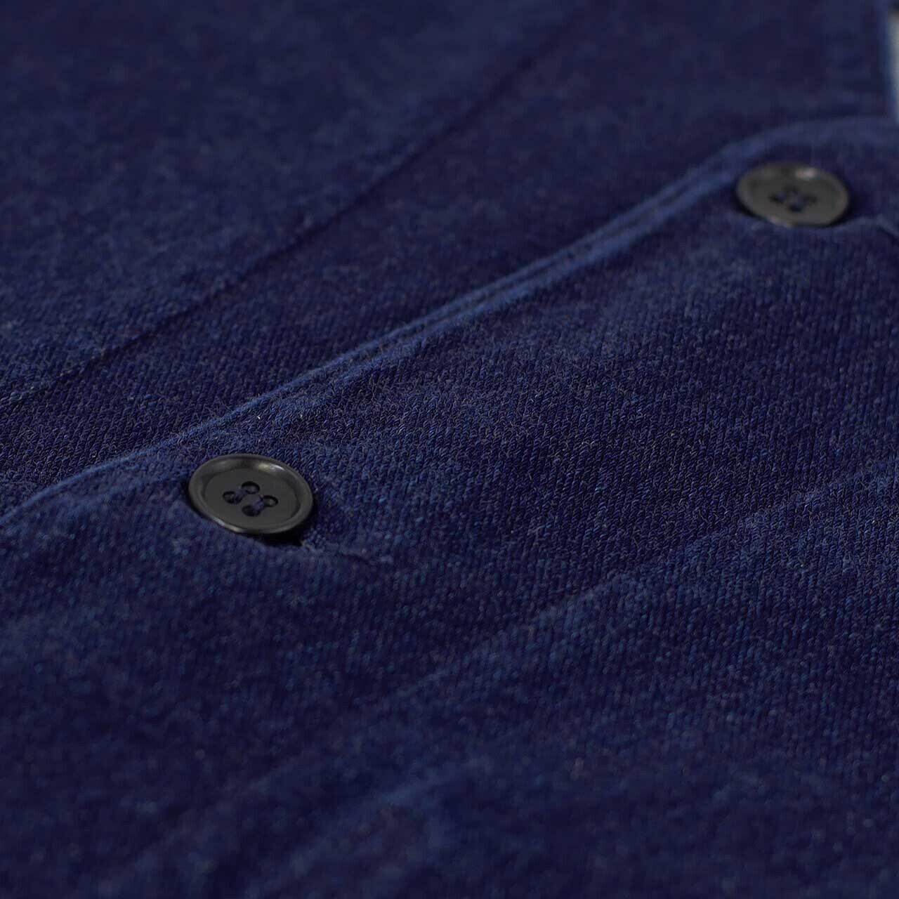 独自のストレッチインレイ素材を用いたノーカラーのカバーオール。糸の表面だけが染まり芯部分は白いまま残るロープ染色された糸を使用し、深みのある色に仕上げたニットデニム素材。ハイゲージで編み立てることで、ムラ感が強くハリのあるシャープな表情に仕上げており、indigoカラーに関しては着込んでいくことで自然に色落ちし、味わい深い表情に経年変化していきます。編み素材ならではの柔らかい肌当たりと伸縮性を持ち、優れた着心地を実現。丈感やサイズはオーセンティックなカバーオール型をベースにしていますが、ノーカラーデザインにしているので、カーディガン感覚で気軽に羽織れるアイテムに仕上がりました。