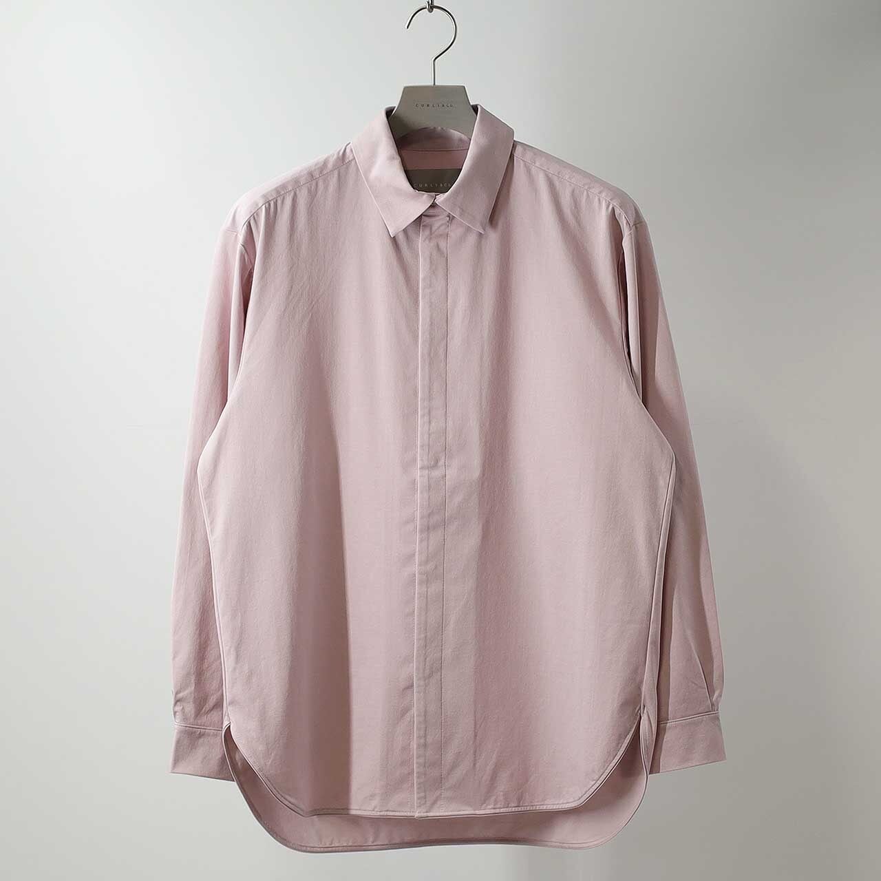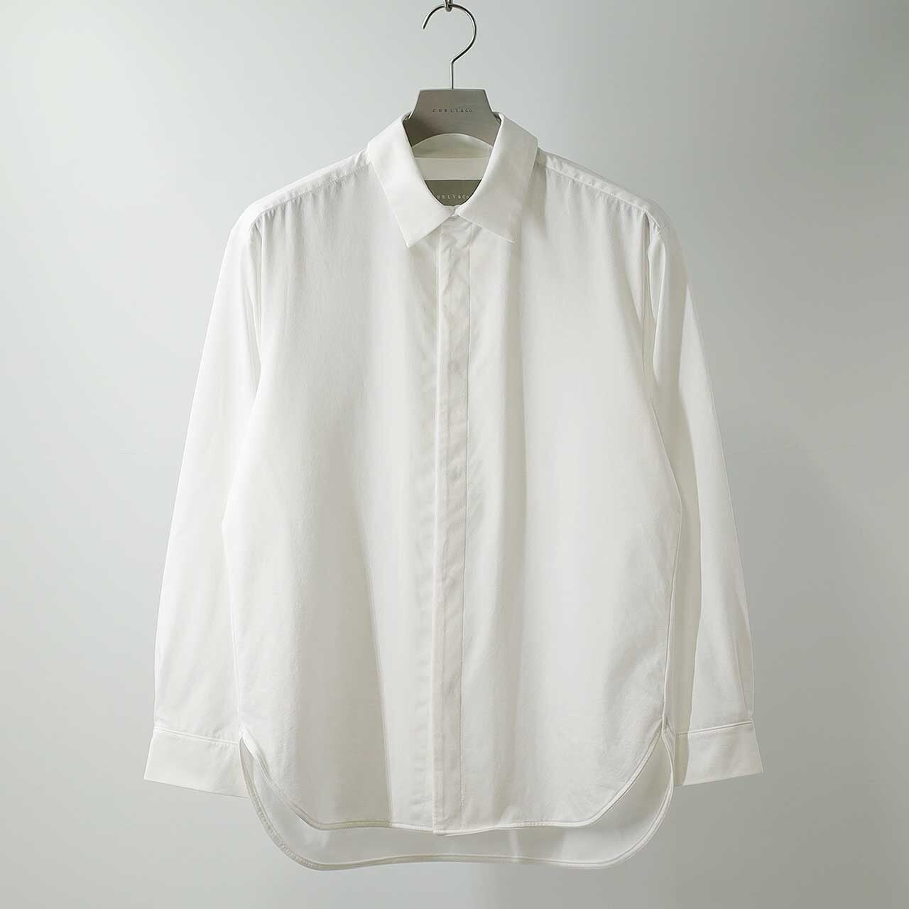ポリエステルとコットンをブレンドして編み立てた天竺素材を用いたシンプルなシャツ。ハイゲージかつプレーティングで編み立てているため、薄さの割には透けにくく、適度なハリ感があり、表面には特殊加工を施し毛羽を抑え、ナチュラルな光沢感のある滑らかな風合いに仕上げています。シルエットは適度なゆとりを持たせながらもスッキリとしたコンパクト仕様。数シーズン定番型として継続していますが、今シーズンはボタンを隠してミニマルに仕上げることにより、シャツジャケット感覚としても着用できます。第一ボタンを外してもだらしなく見えないよう第二ボタンを高めに設定。開きの無い独自の筒袖カフス仕様。裾は折り返しではなく裏バインダー仕様にする事で、美しいラウンドの形を実現しています。バックヨークにはカットソー素材では難しいギャザーを施し、クラシックな印象を加えています。