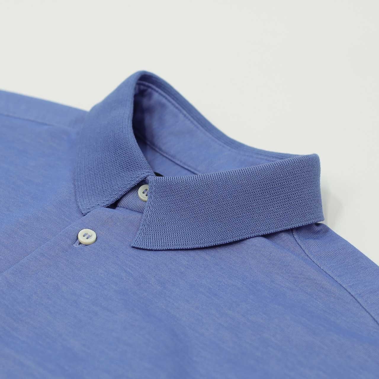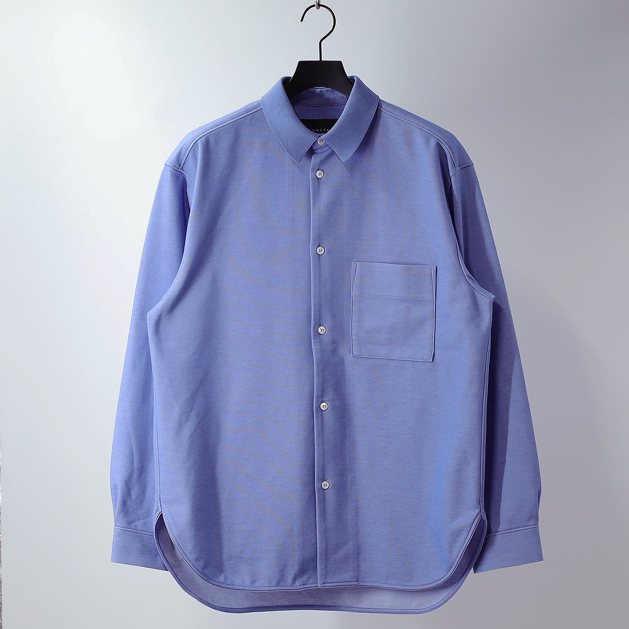 シーアイランドコットンにポリエステルをブレンドした鹿の子ジャージーを用いたポロカラーのシャツ。カリブ海のバルバドス共和国とジャマイカで栽培された37mm以上の超長綿であるシーアイランドコットンをイタリアALBINI社にて紡績し、日本国内で編み立てられました。光沢も美しくしなやかな反面繊細でもあるので、ポリエステルをブレンドすることで耐久性を強め長く着用できるように工夫しました。形自体はオーソドックスなシャツですがオリジナルで編み立てたポロ襟がさりげなく個性を引き立てます。ストレッチ性もありシワにもなりにくいジャージー素材ならではのシャツ。