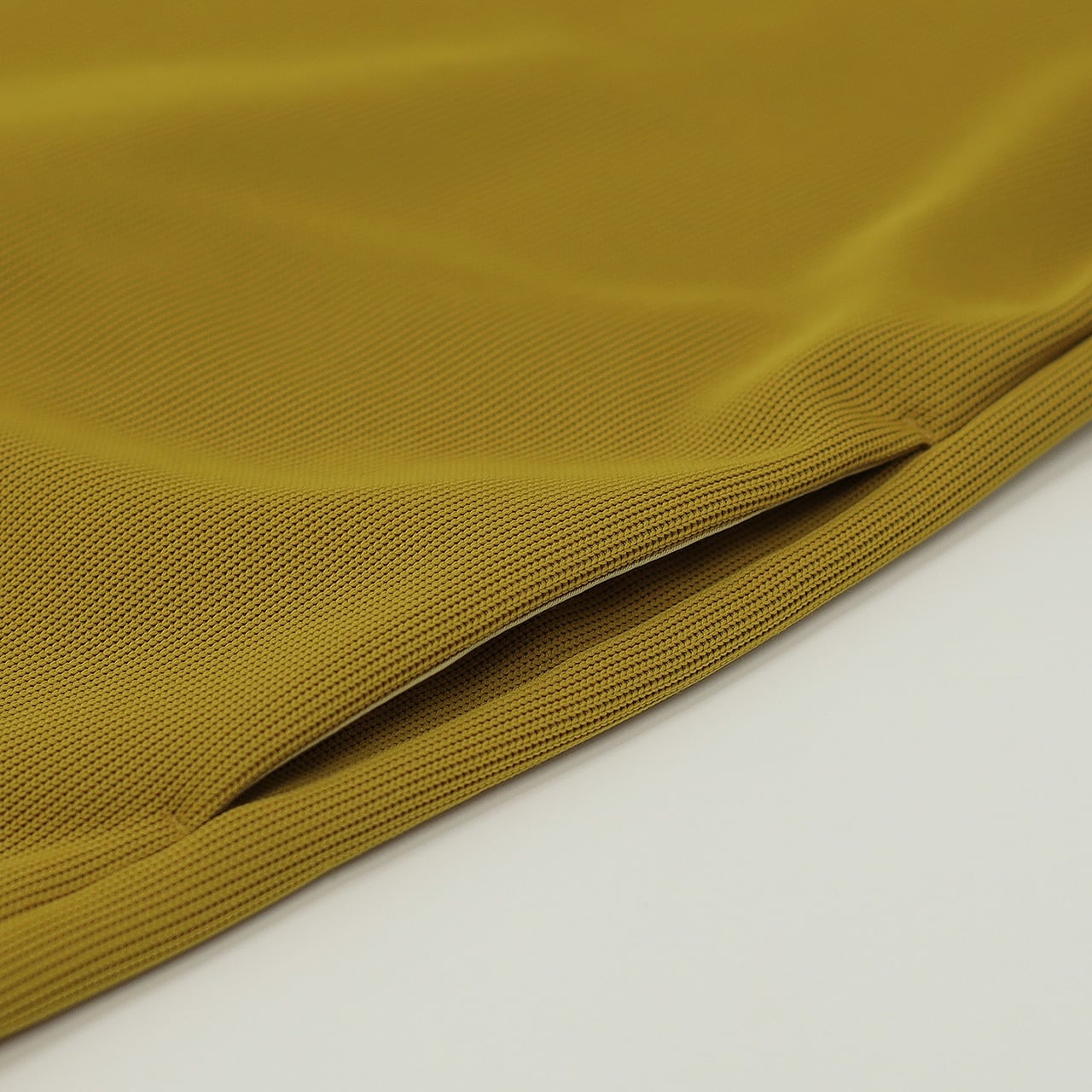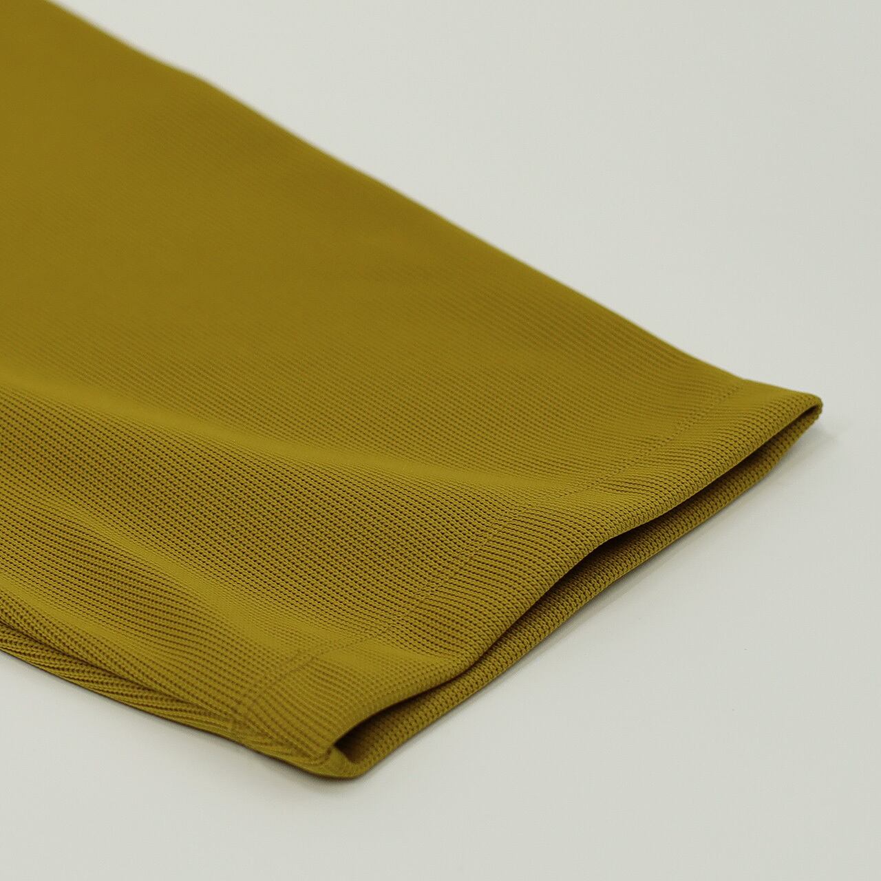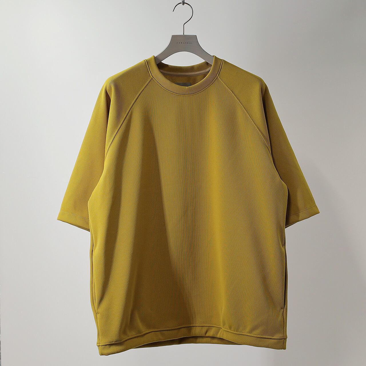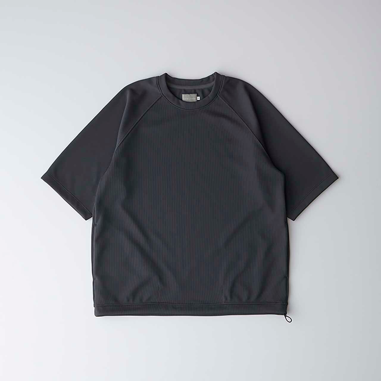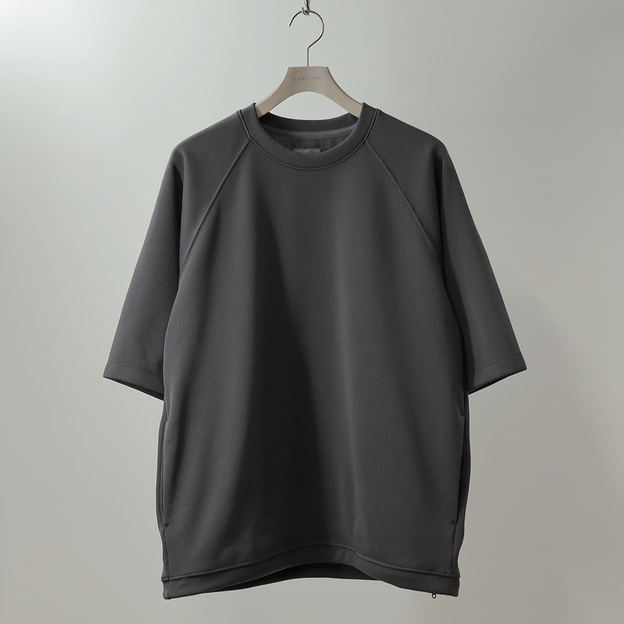 リサイクルポリエステルで編み立てたダブルフェイス素材を用いたクルーネックTシャツ。回収した原料をケミカルリサイクルによって一度引き揃えの三子糸にした後に仮撚りという工程を経て、表面の風合いに変化を出しています。ラグランスリーブの袖丈を少し長めに設定し、身幅にも適度なゆとりを持たせたリラックスシルエット。裾のドローコードを絞って丸みを出すこともできます。厚すぎず薄過ぎずの生地なので長いシーズン着用可能。シームポケット有り。