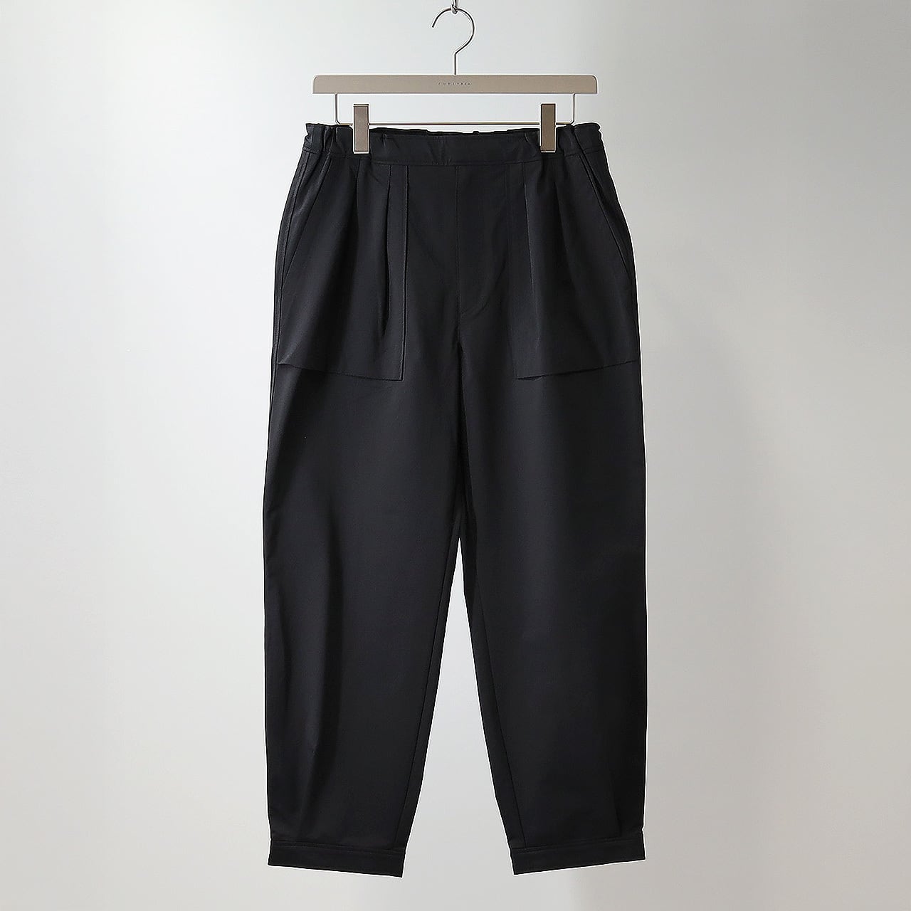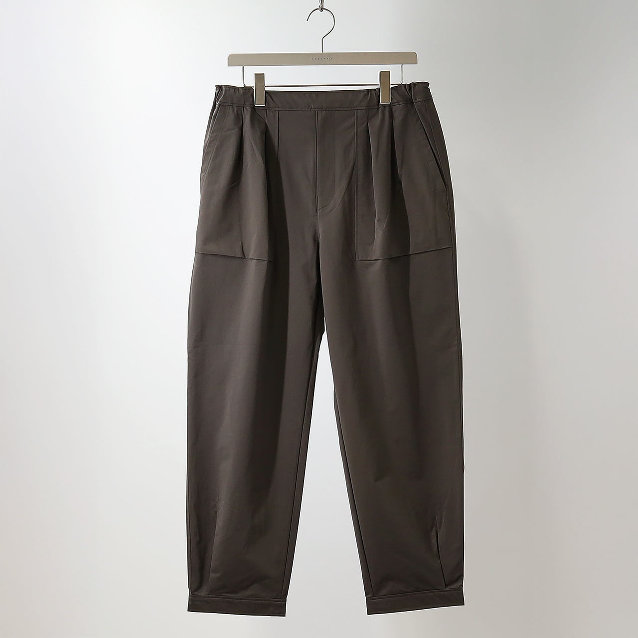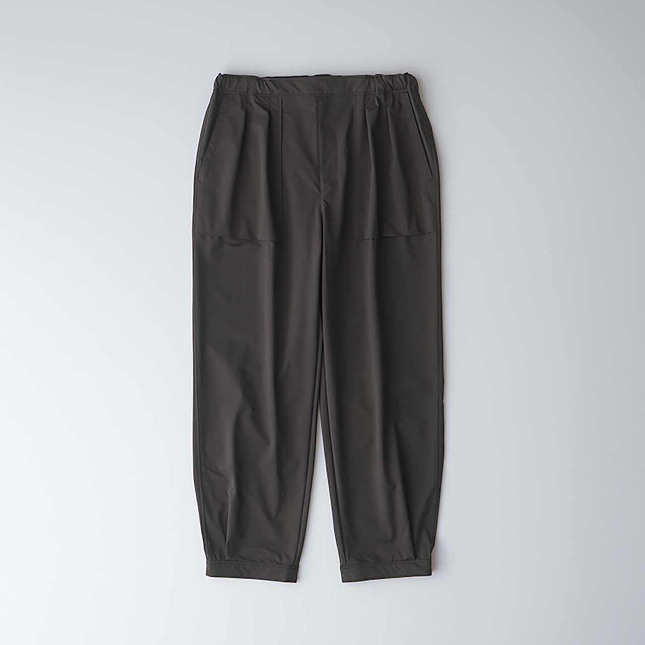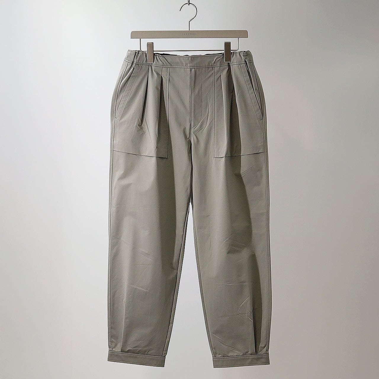蝶理(株)の高伸縮機能糸TEXBRID®をハイゲージで編み立てたタフタ素材を用いて裾にタックを施したリラックスEZパンツ。ウエストには適度なゆとりを持たせ裾にカフスをつけタックを入れる事で、ガーデニングパンツのシルエットをタウンユースに落とし込みました。フロントポケットは底にタックのあるパッチポケット、バックはパッチポケットと三角フラップ付きの両玉縁ポケットを採用。ウエスト部にはゴムとコードを入れたフルイージー仕様ですが前あきファスナー有。いわゆる”シャカパン”的な存在ですが、生地の擦れる音もせずに、ストレッチもあるので快適な履き心地になります。また、46ゲージのハイゲージ高密度に撥水加工を施しているので咄嗟の雨にも対応できます。