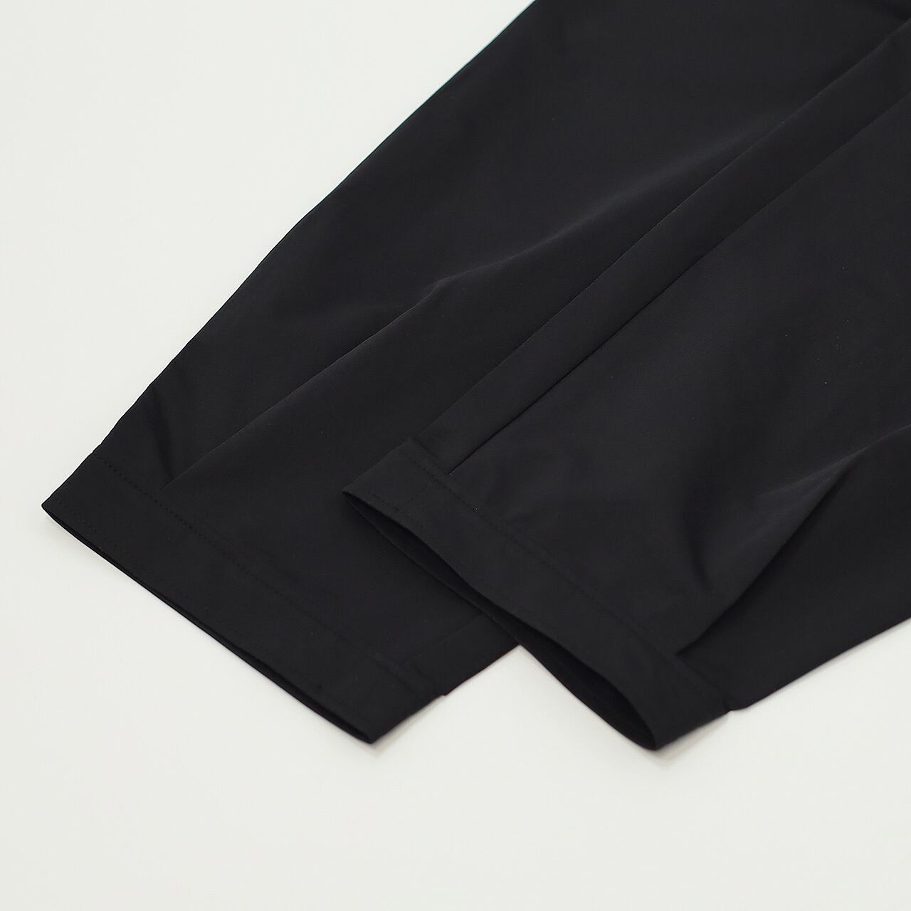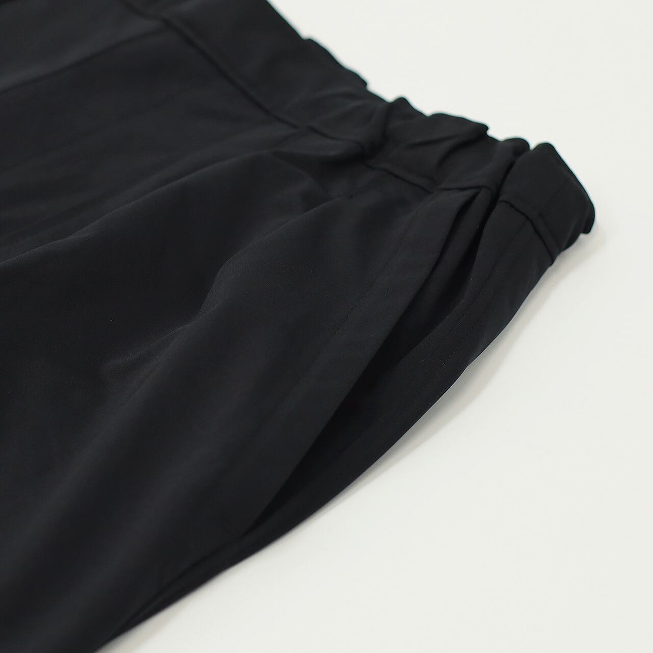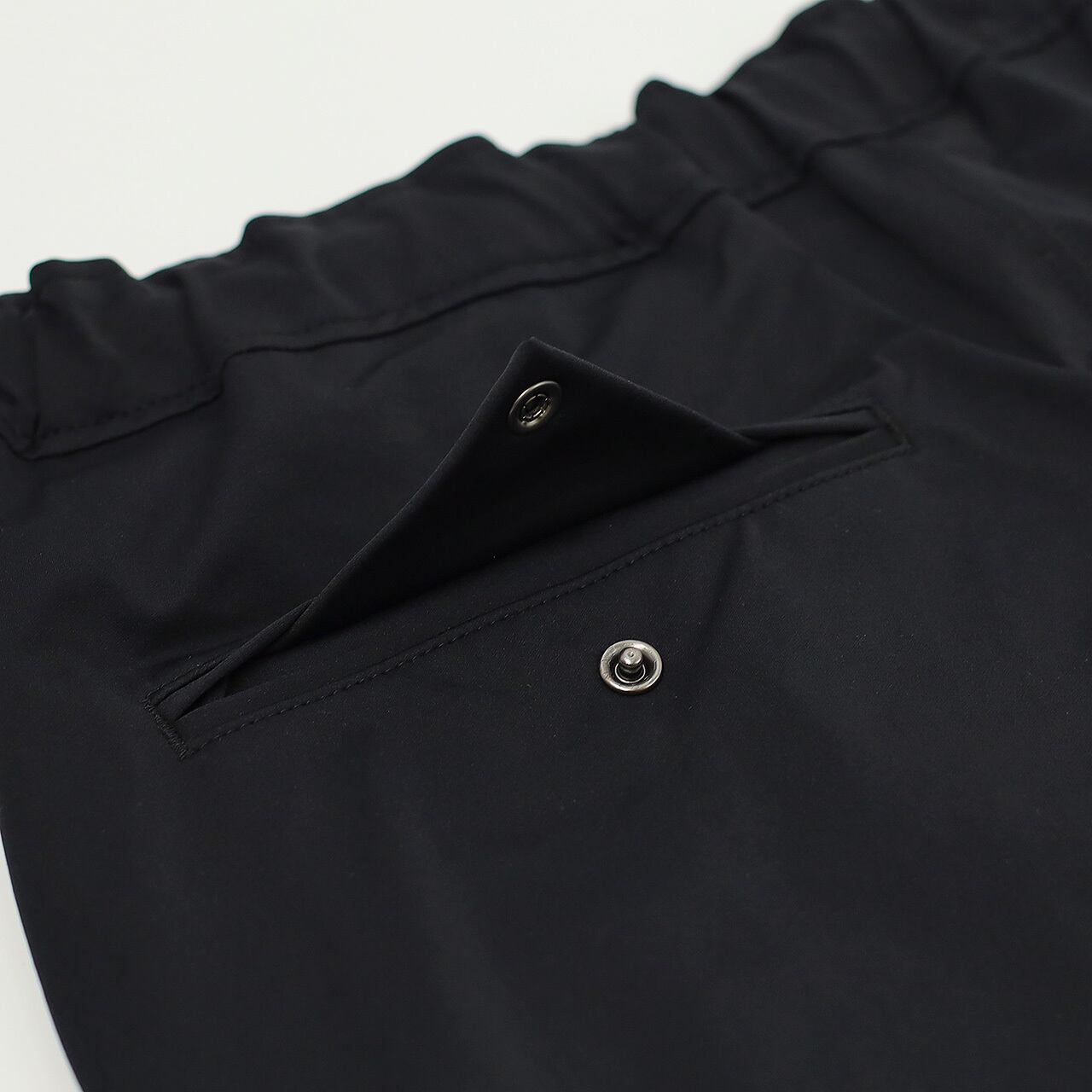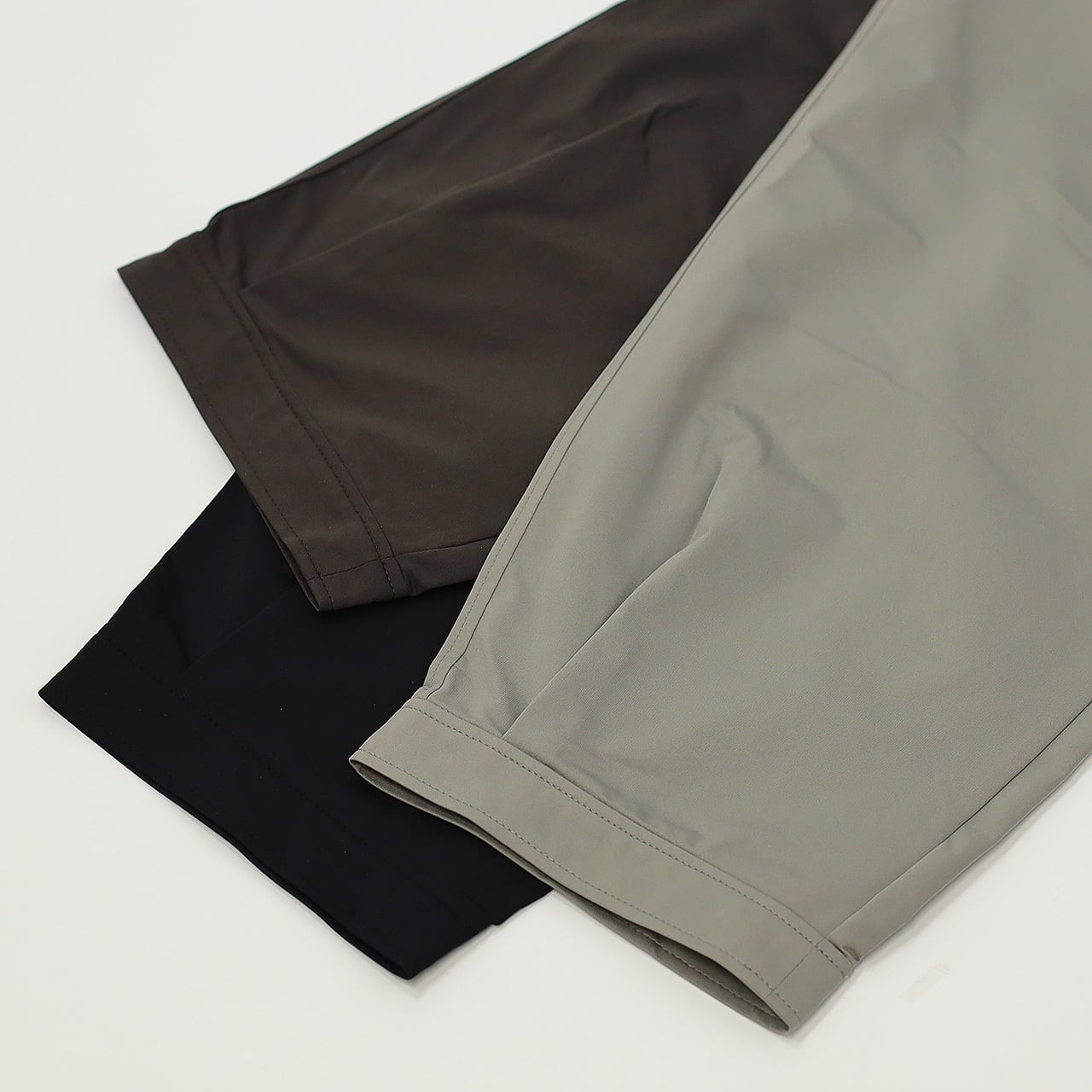 蝶理(株)の高伸縮機能糸TEXBRID®をハイゲージで編み立てたタフタ素材を用いて裾にタックを施したリラックスEZパンツ。ウエストには適度なゆとりを持たせ裾にカフスをつけタックを入れる事で、ガーデニングパンツのシルエットをタウンユースに落とし込みました。フロントポケットは底にタックのあるパッチポケット、バックはパッチポケットと三角フラップ付きの両玉縁ポケットを採用。ウエスト部にはゴムとコードを入れたフルイージー仕様ですが前あきファスナー有。いわゆる”シャカパン”的な存在ですが、生地の擦れる音もせずに、ストレッチもあるので快適な履き心地になります。また、46ゲージのハイゲージ高密度に撥水加工を施しているので咄嗟の雨にも対応できます。