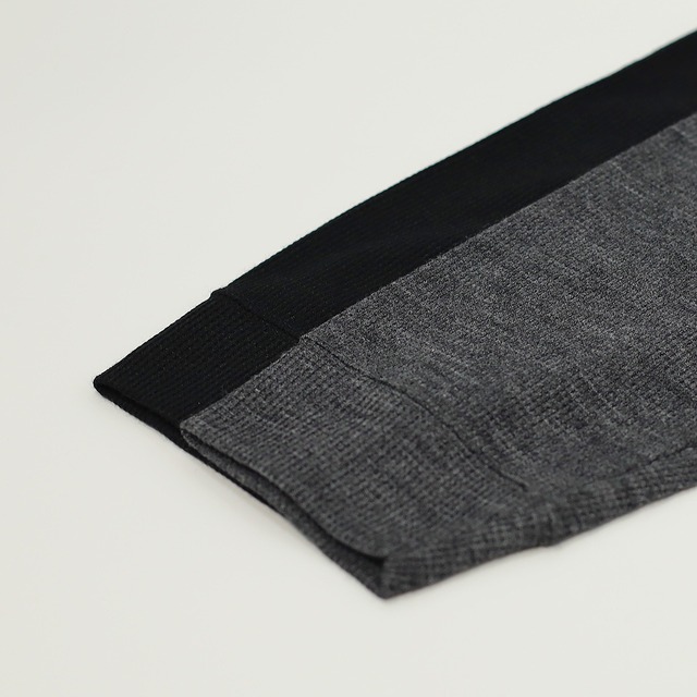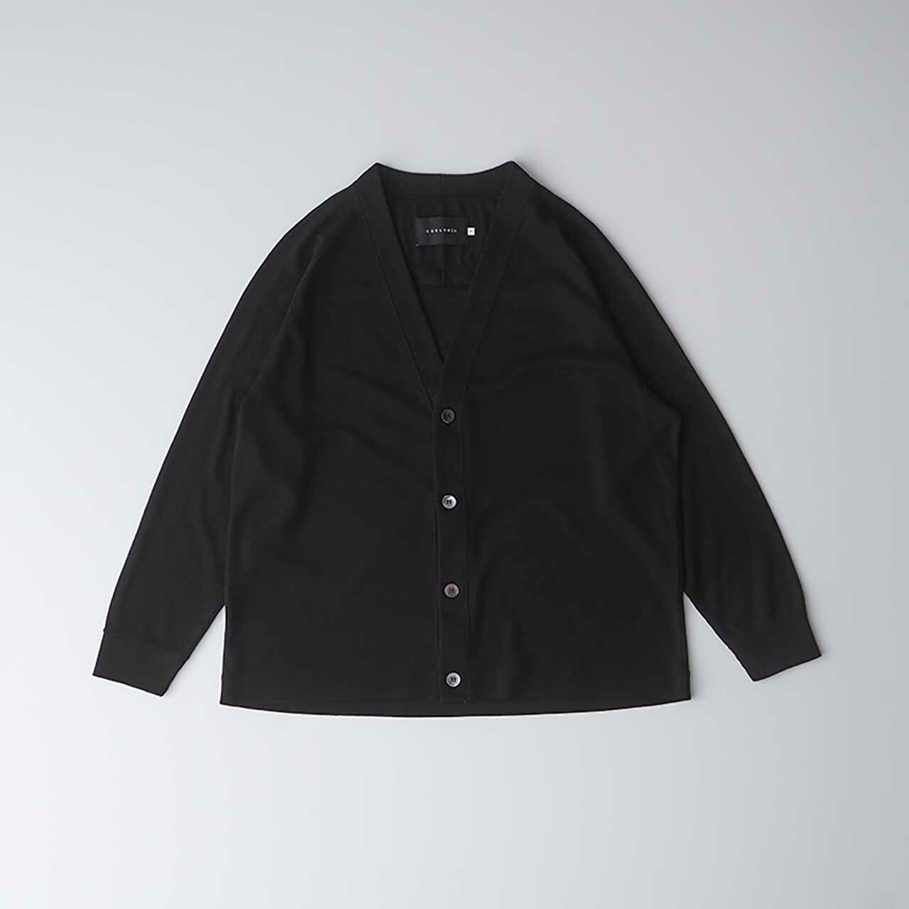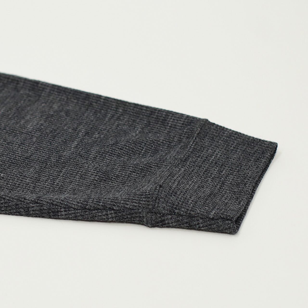 ポリエステルブレンドのウールワッフルを用いた4つボタンのカーディガン。オーストリアメリノウールの繊維束の内側に、螺旋状に交撚させたリサイクルポリエステルを入れ込み、伸縮性とキックバックを高めているので、ワッフル組織でありながらもダレることなく上品な見映えになります。さらにウール本来が持つ温度調整、抗菌、吸水性の機能にクールマックス®︎をブレンドさせることで、優れた着心地を与えてくれます。前はラグランスリーブですが後ろはヨークスリーブを採用しているので、よりリラックス感が醸し出され、またワッフルというカジュアル寄りな素材ですがポケットなどを極力省き、貝ボタンをアクセントに添え、ミニマルでエレガントに仕上げています。