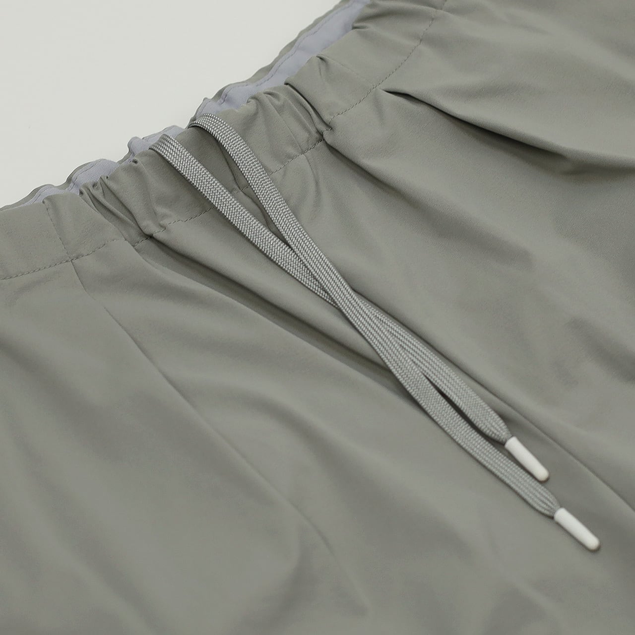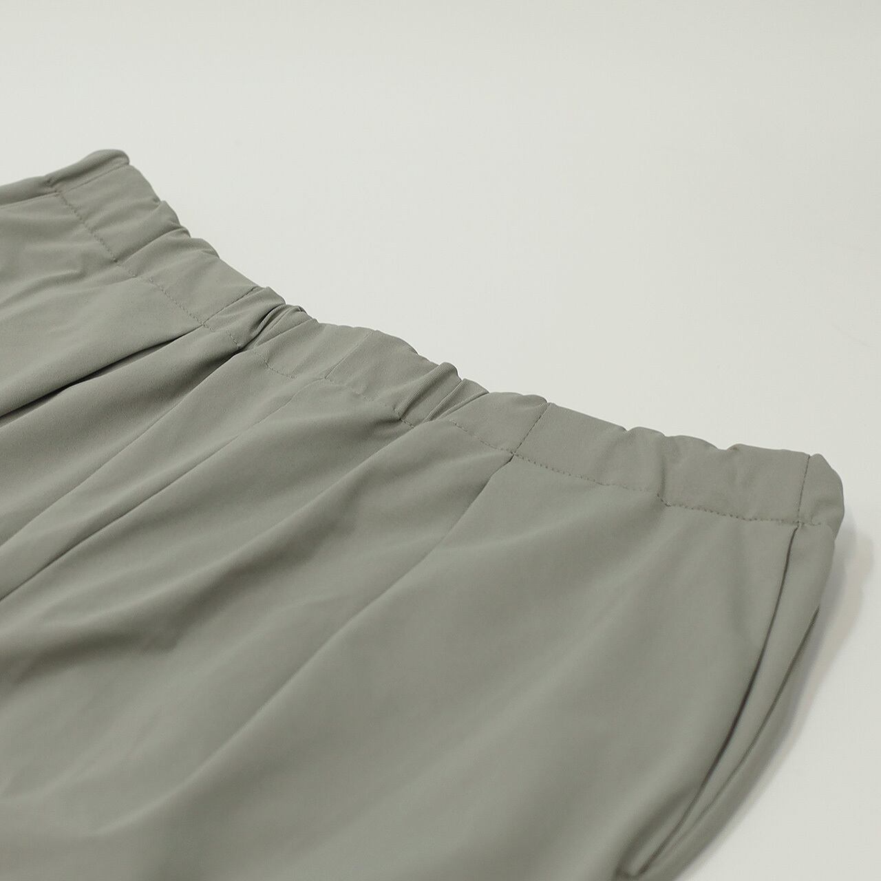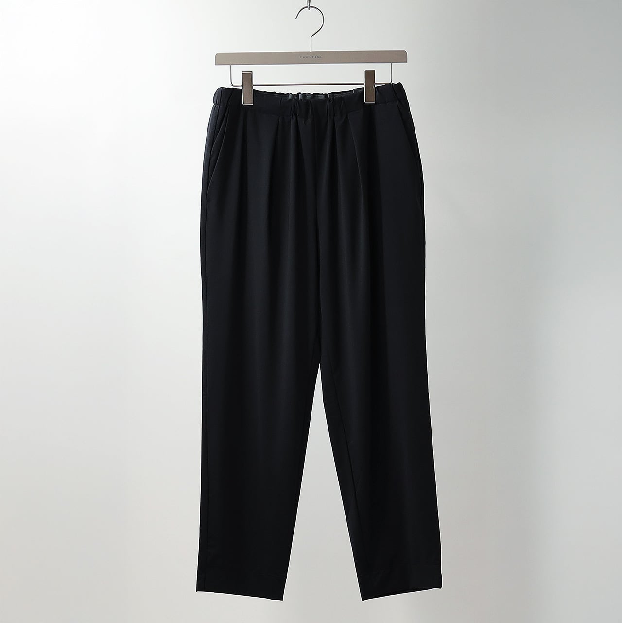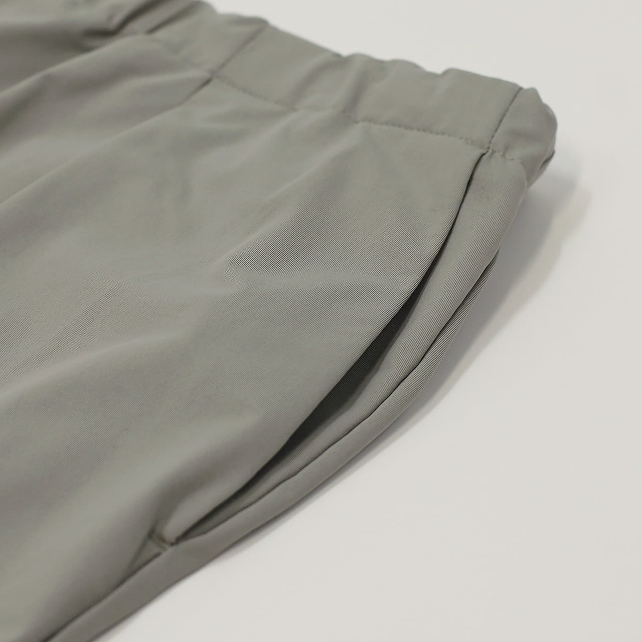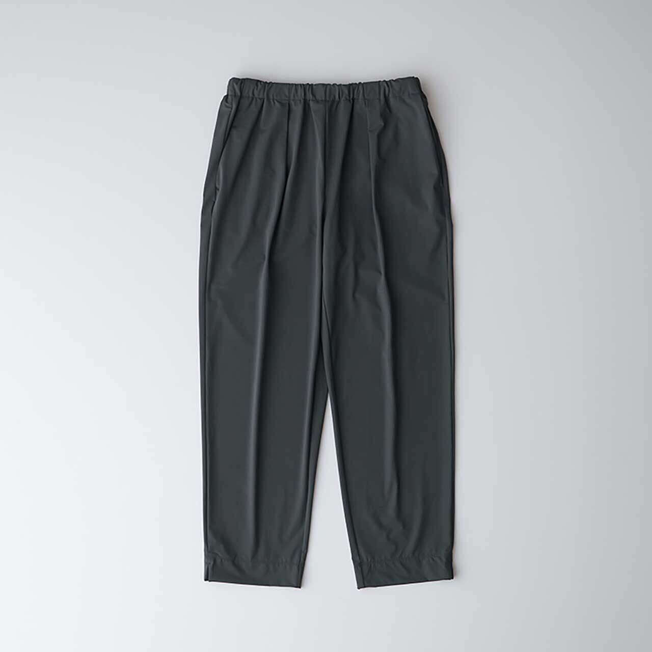 ストレッチナイロントリコット素材を用いたEZパンツ。32ゲージの高密度で編み上げ、ポリウレタンを高含有率にてブレンドしたため、50%を超えるストレッチを持ちながらもキックバックにも長けています。スラックスベースのテーパードシルエットなのでラフになりすぎず綺麗にコーディネートがまとまり、また、シワにもなりにくく接触冷感機能もあるので、履き心地は抜群です。