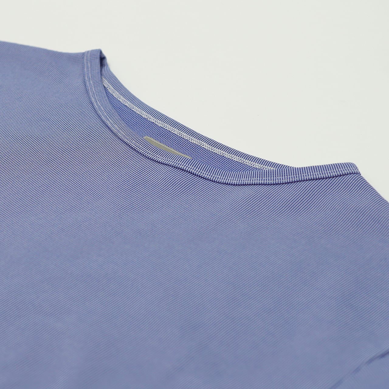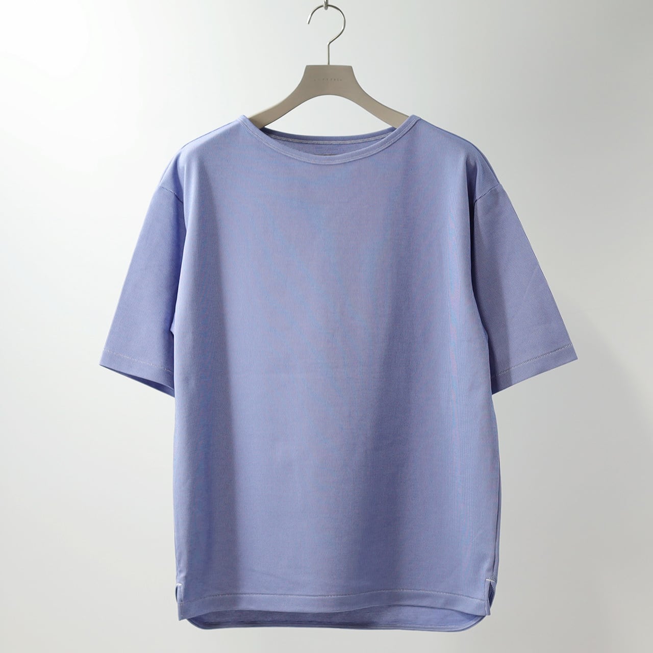 スーピマコットンにポリエステルをブレンドさせたサーフニットを用いたボートネックTシャツ。アメリカのカリフォルニア州コーコラン地域で収穫されるスーピマコットンをイタリアALBINI社が名付けたのが”CORCORAN”であり、スーピマコットンの中でも最も繊維が長く強度にも優れている特徴を持ちます。そこに更にポリエステルをブレンドすることで吸水速乾性という機能性を持たせました。シャリ感がありながらも上質なコットンをちゃんと感じさせる風合いです。袖丈を少し長めに設定し、天幅と前下がりを絶妙に計算したボートネックの形は、男女問わず綺麗に見えるバランスに仕上げています。ストレートな前裾に対して後ろ裾のみラウンドさせて変化を出しています。