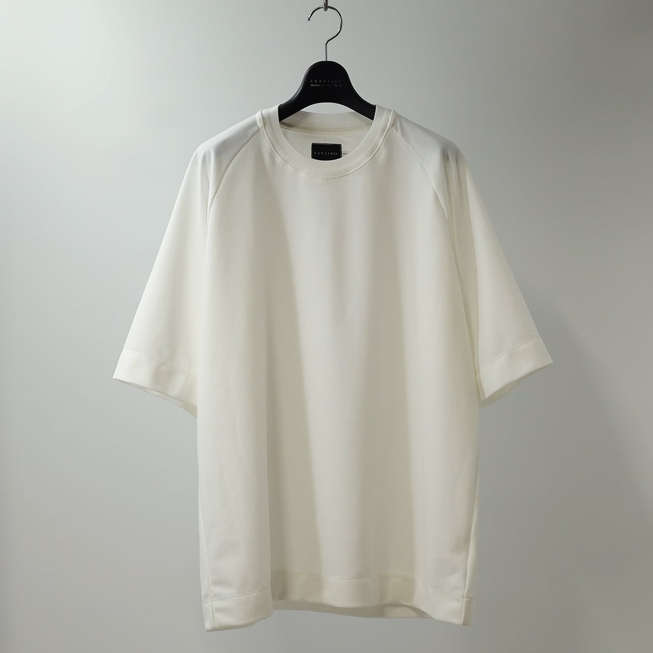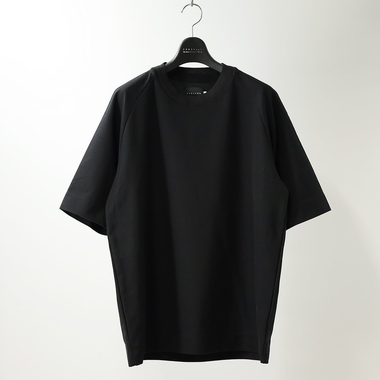 シーアイランドコットンにポリエステルをブレンドした鹿の子ジャージーを用いたクルーネックTシャツ。カリブ海のバルバドス共和国とジャマイカで栽培された37mm以上の超長綿であるシーアイランドコットンをイタリアALBINI社にて紡績し、日本国内で編み立てられました。光沢も美しくしなやかな反面繊細でもあるので、ポリエステルをブレンドすることで耐久性を強め長く着用できるように工夫しました。適度な張り感があるのでボディのラインを拾わずにシルエットが綺麗に保てますし、鹿の子組織は肌に触れる面積が小さいので肌離れも抜群。オリジナルで編み立てた襟リブは組織を変える事でラインを出しさりげないデザインポイントになっています。
