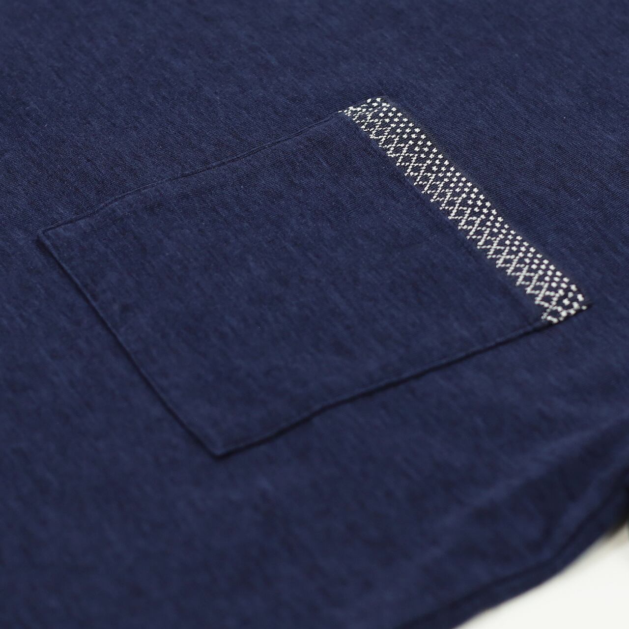 オーガニックコットンの天竺ジャージーを用いたクルーネックTシャツ。カチオン綿とオーガニック綿を精密にブレンドして紡績した糸を使用しているので、TOP糸とは違ったヴィンテージ風味のある細やかな杢調模様を表現しています。また生地に膨らみ感としなやかさがあるので、最初から肌への馴染む風合いになっています。そこにオリジナルで編み立てたドットとダイヤ柄モチーフのリブを襟とポケット口にあしらい、モダンなエスニック調に仕上げています。一枚で着用は勿論のこと、羽織りとコーディネートすると首元のアクセントが際立ちます。