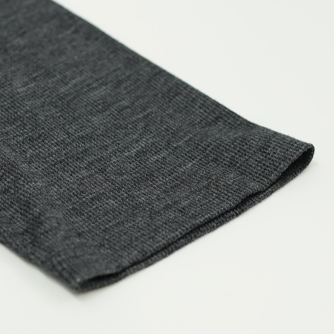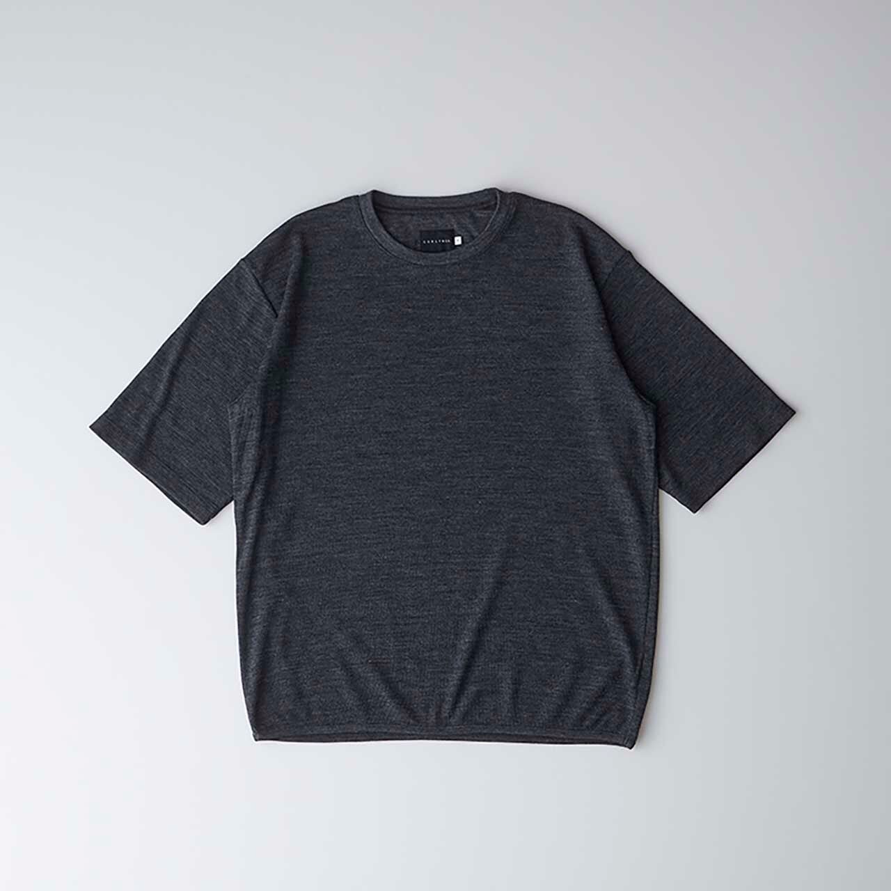 ポリエステルブレンドのウールワッフルを用いた半袖Tシャツ。オーストリアメリノウールの繊維束の内側に、螺旋状に交撚させたリサイクルポリエステルを入れ込み、伸縮性とキックバックを高めているので、ワッフル組織でありながらもダレることなく上品な見映えになります。さらにウール本来が持つ温度調整、抗菌、吸水性の機能にクールマックス®︎をブレンドさせることで、優れた着心地を与えてくれます。少し長めの袖丈と裾をバインダー仕様で縮めているので、リラックス感もありながらもすっきりとした仕上がりになっています。