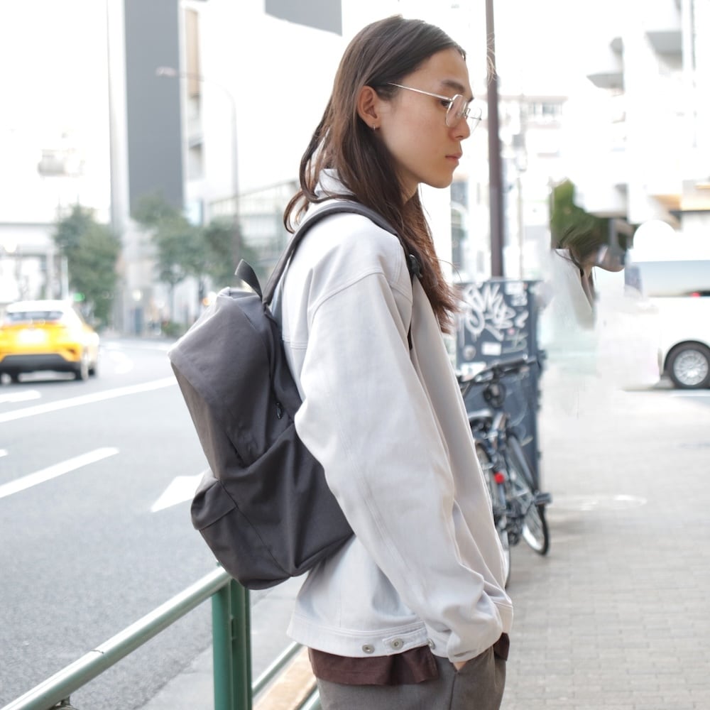 ちょっとしたお出かけには十分なサイズですし、しっかり背負うのはもちろん、片方の肩にひょいっと軽くかける感じも春夏の軽めのスタイリングには力が抜けていいんじゃないかと思っています。